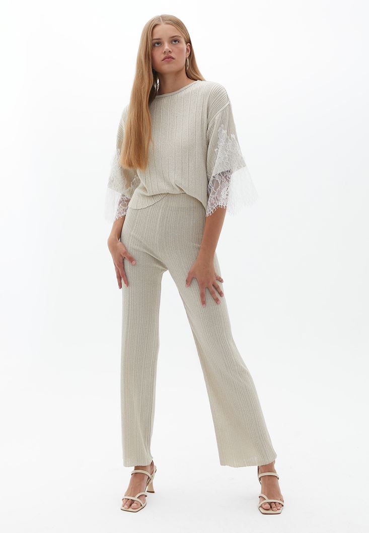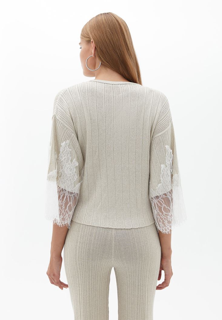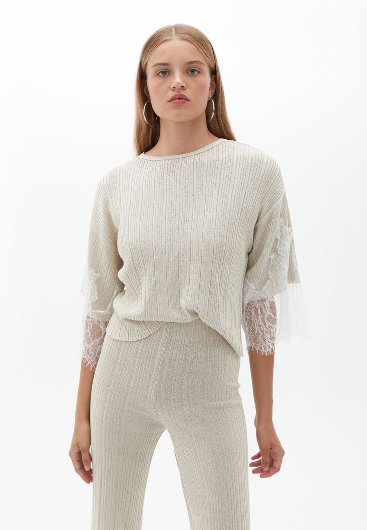 Viskon karışımlı özel triko, bot yaka, truvakar kol, kol ucu dantel detaylı, bedenden uzak relax fit, standart boy, fitilli doku.