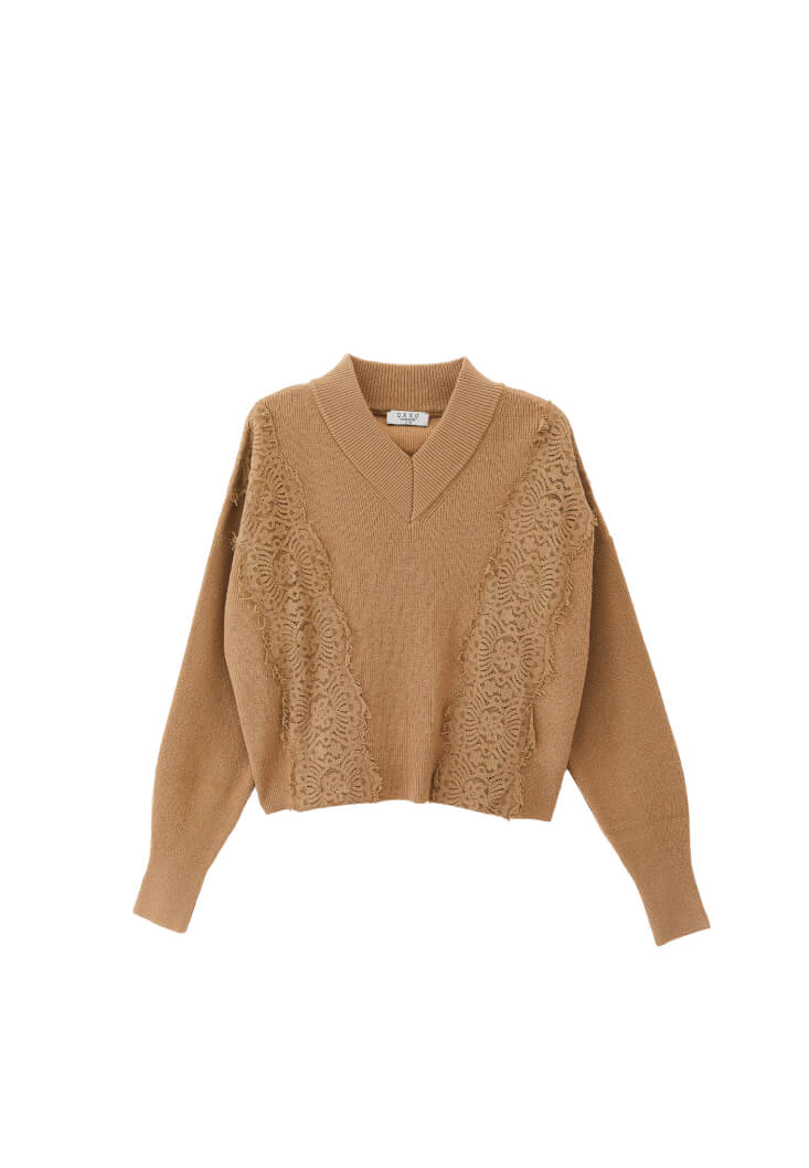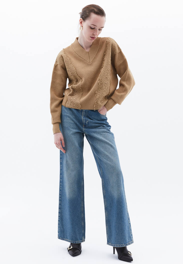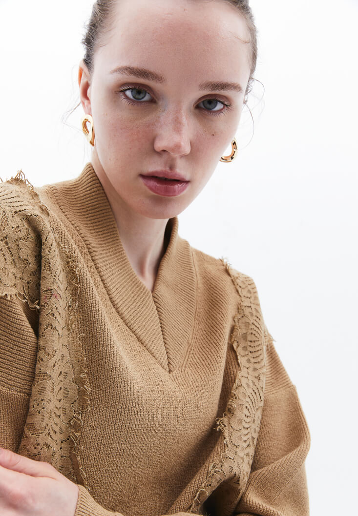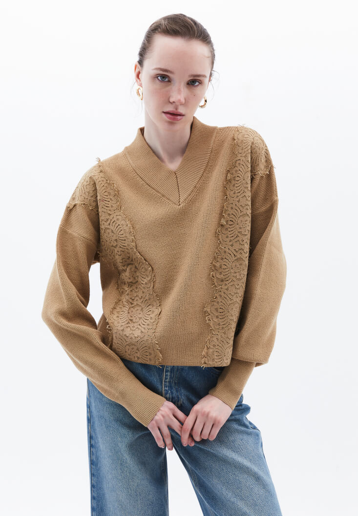 • Bayan Kahverengi Dantel Detaylı Kazak