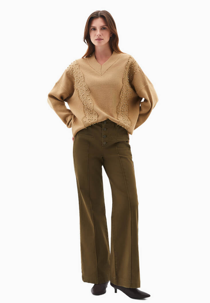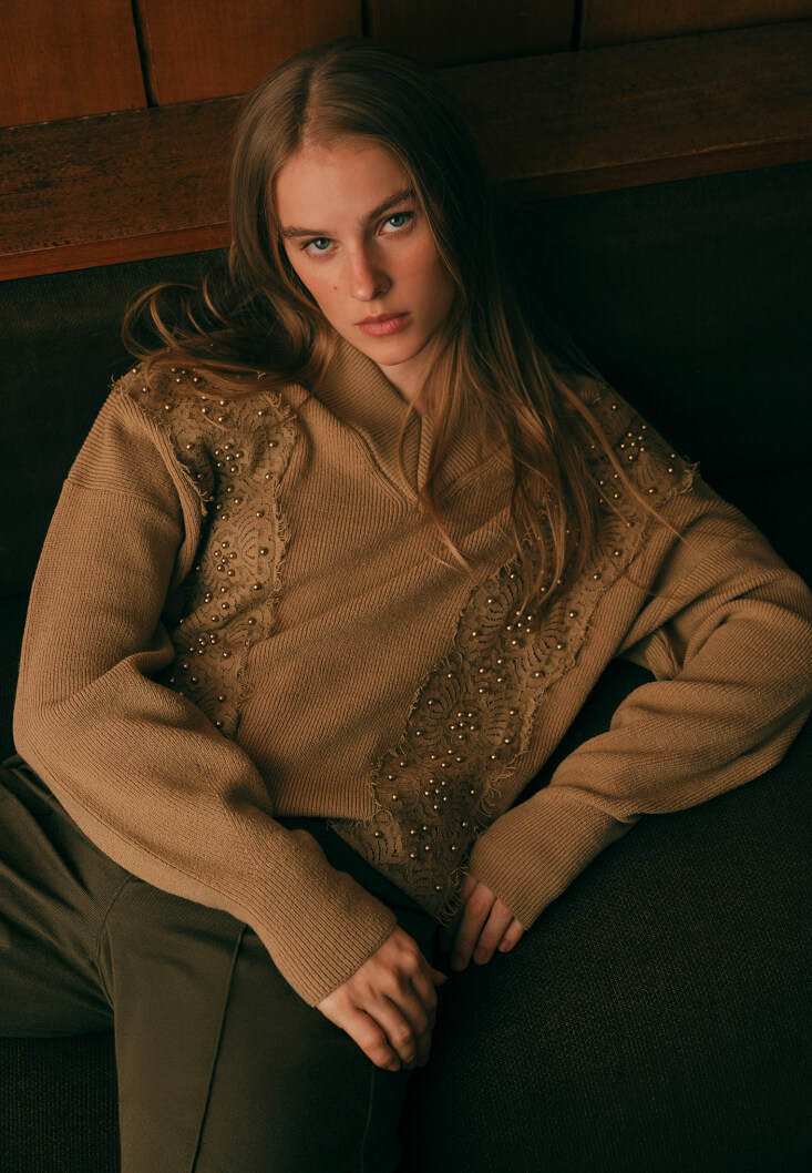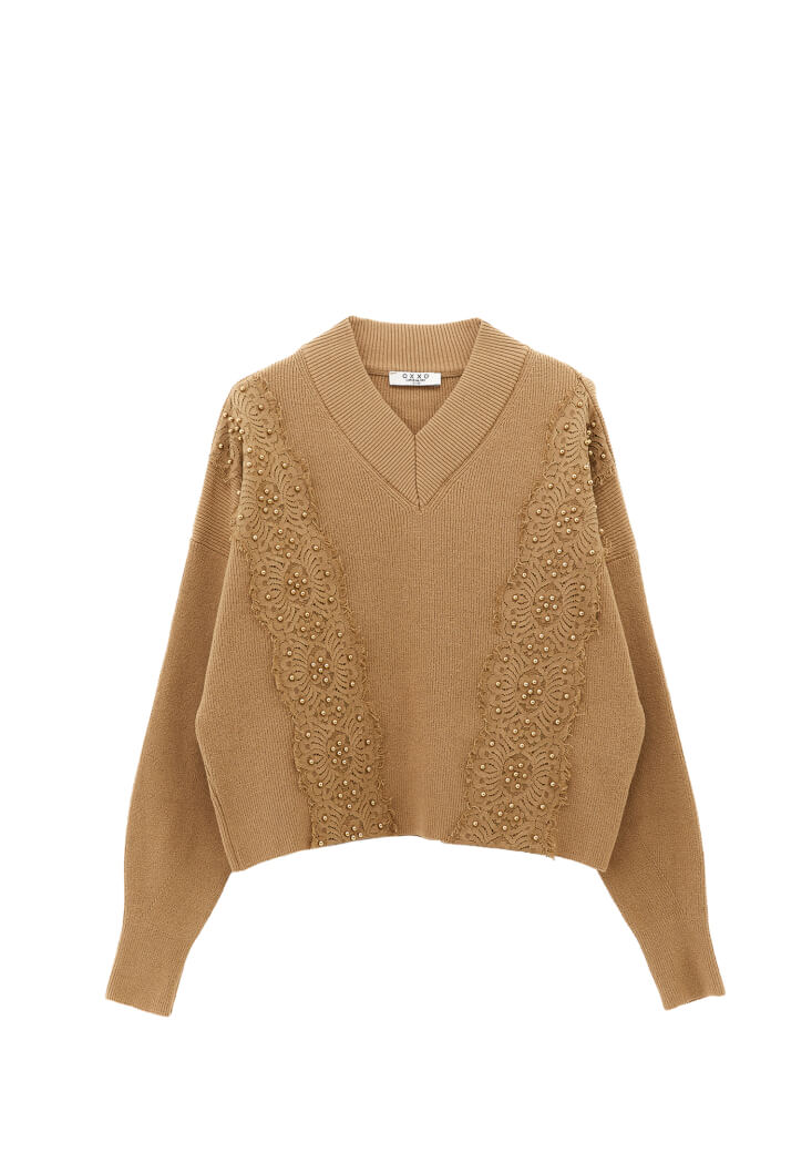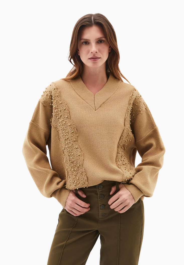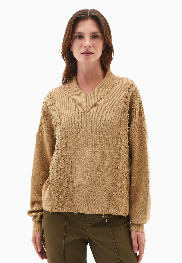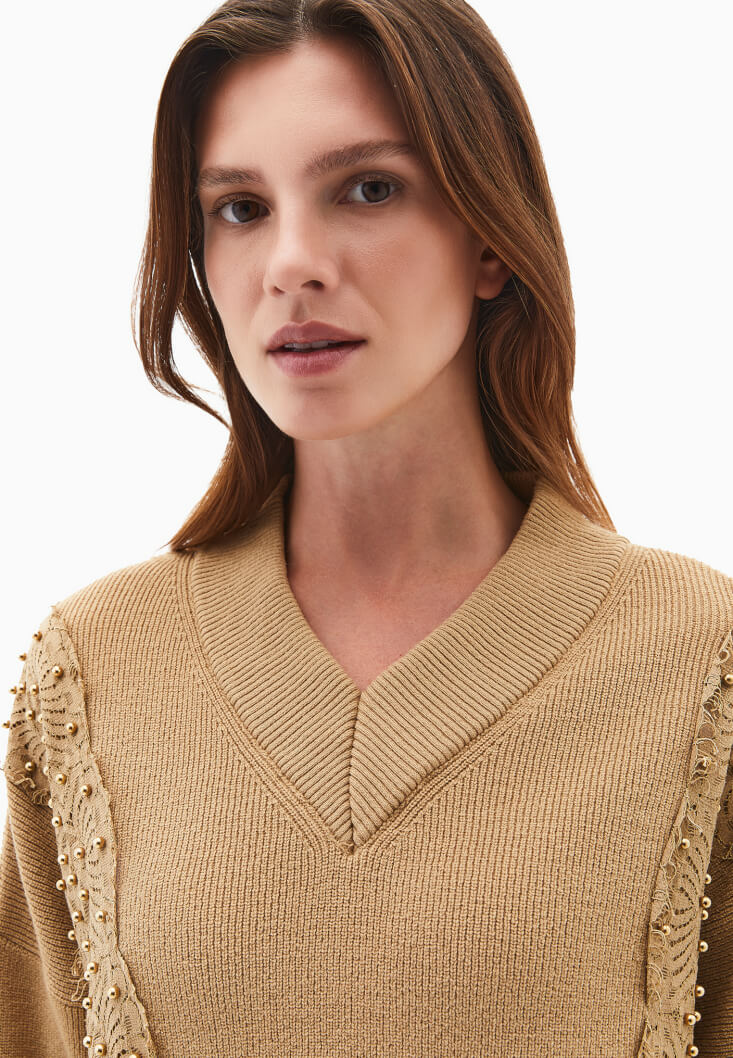 Kahverengi Dantel Detaylı Kazak