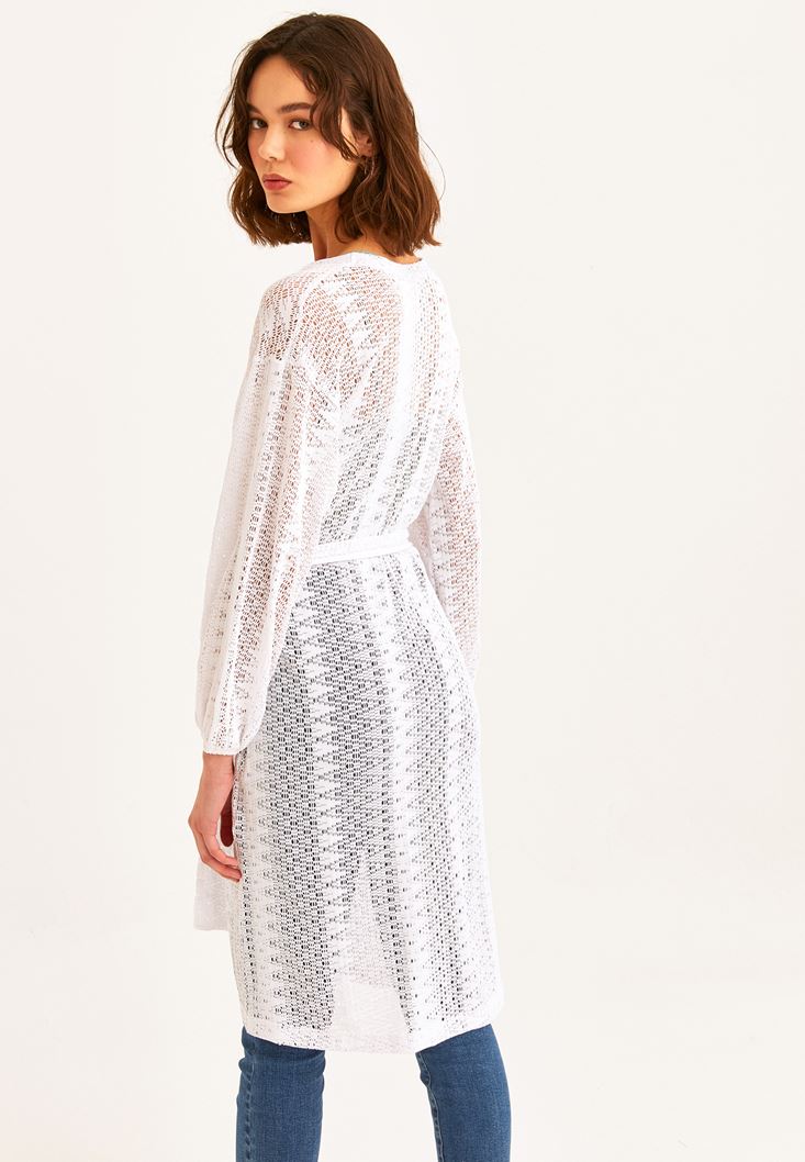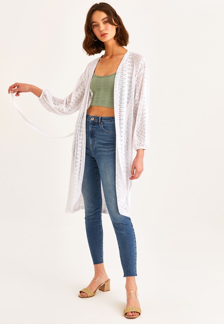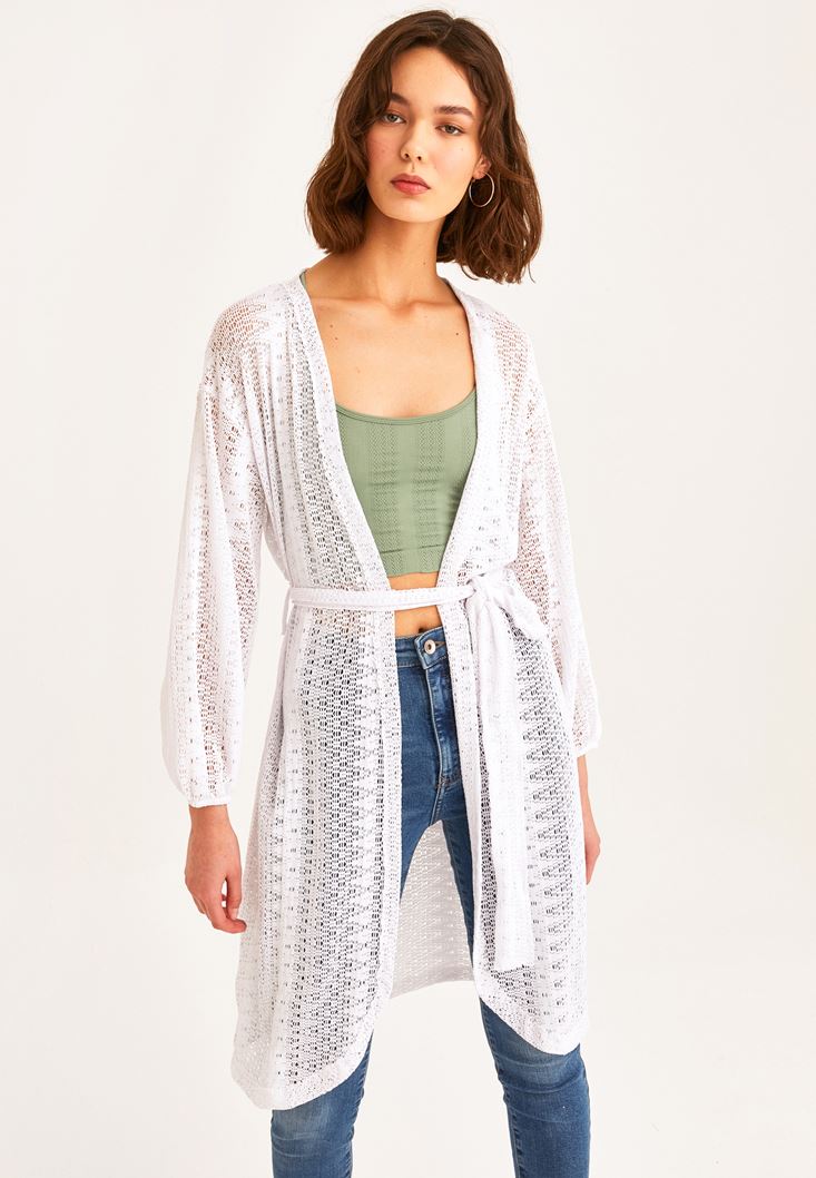 Dantel Detaylı Kimono modeli, romantik görünümü ve hoş dokusu ile yeni sezonu karşılıyor. Uzun kimono modeli; belden kuşaklı yapısı, balon kol detayı ve dantelli görünümü ile Oxxo'da sizlerle buluşuyor. Kadın kimono modeli, kombinlerinizi en iyi şekilde tamamlamanız için ideal bir seçenek oluyor. Askılı atletlerle ve mini şortlarla oluşturacağınız harika kombinleri uzun kimono modeli ile taçlandırabilirsiniz. Kadın kimono modeli ile elde edeceğiniz etkileyici duruşu topuklu terliklerle vurgulayabilirsiniz. Oxxo'nun sevilen dokularla ve dikkat çeken ayrıntılarla sizlere sunduğu uzun kimono modelleri ile tarzınıza farklılık katabilirsiniz.