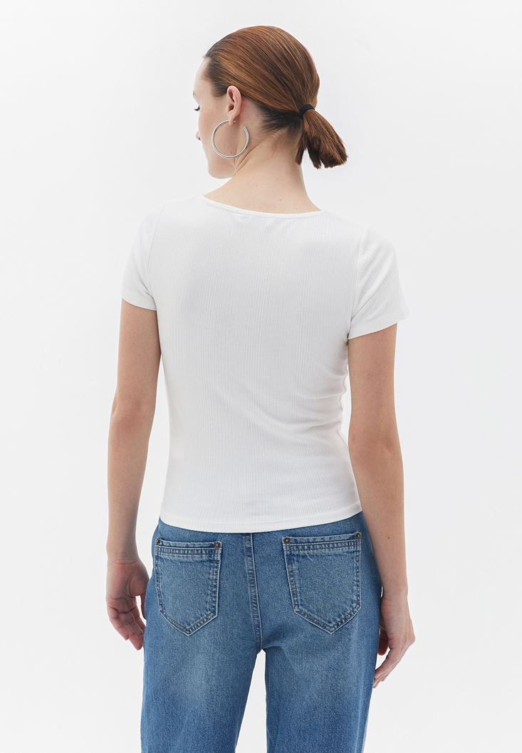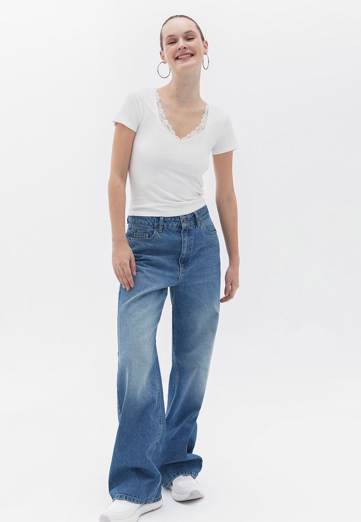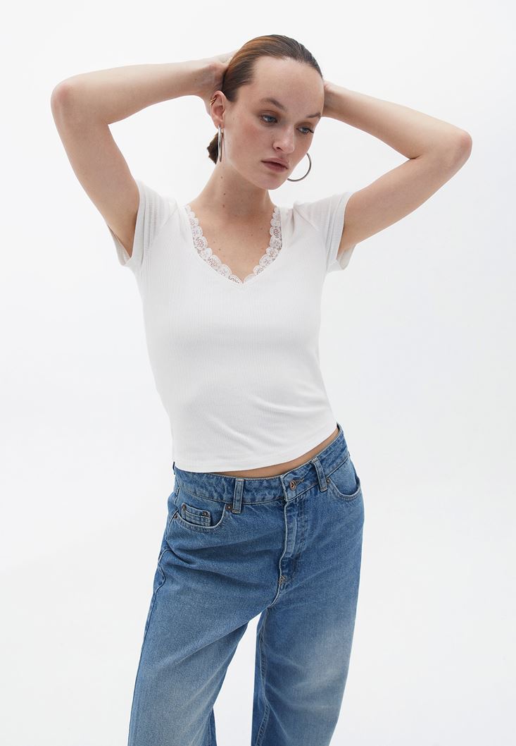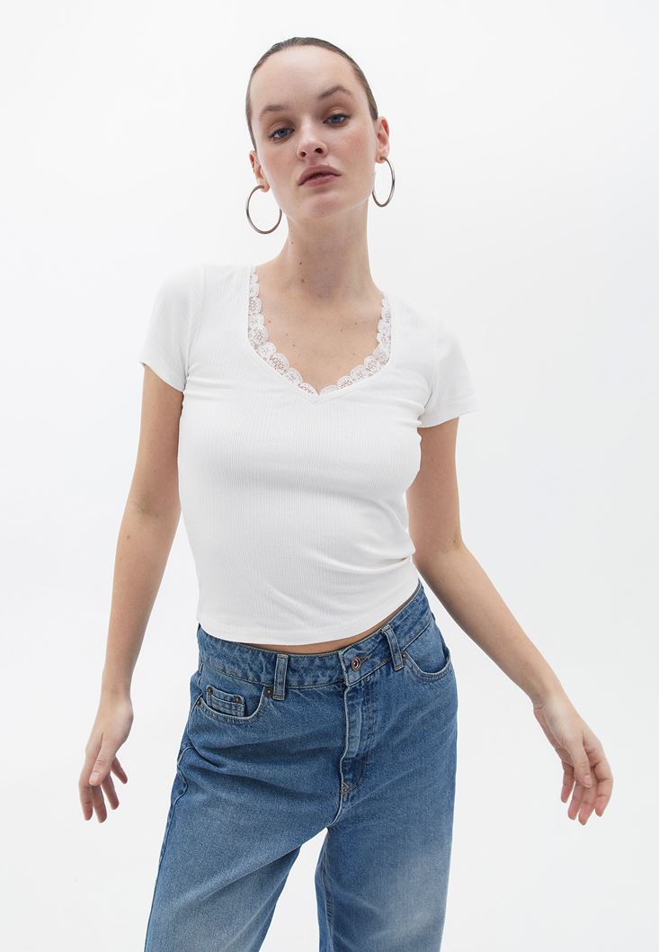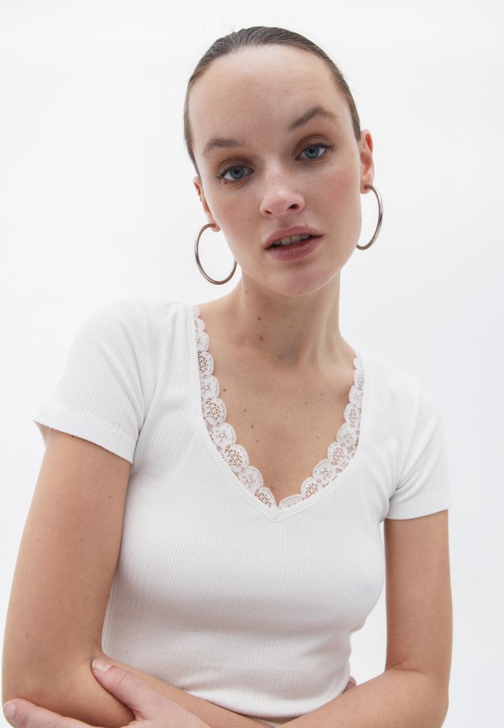 Krem Dantel Detaylı Tişört