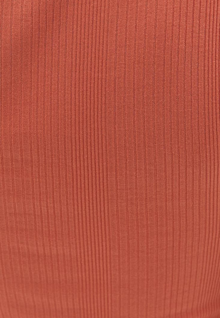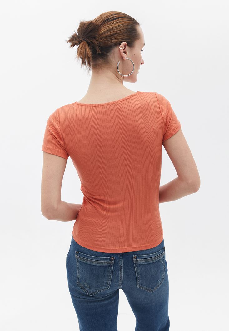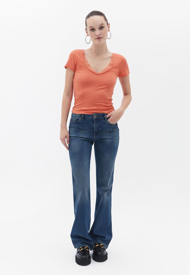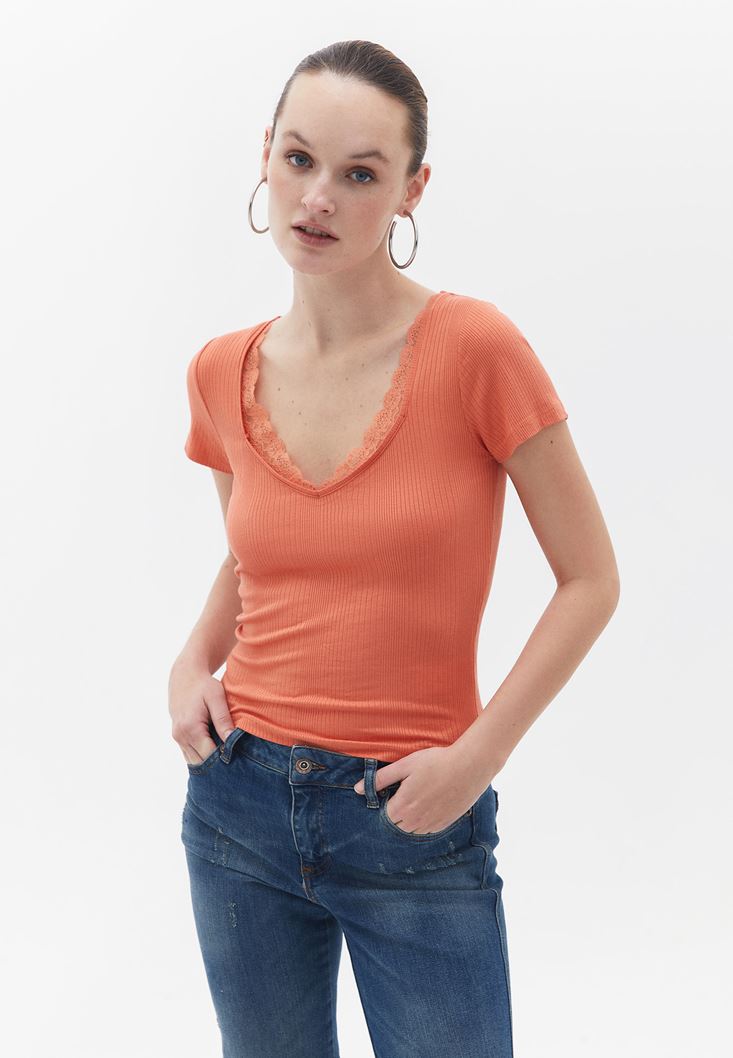 Viskon içerikli esnek doku, bedeni saran fit, kısa kollu, V yaka, yakası dantel detaylı, fitilli doku.