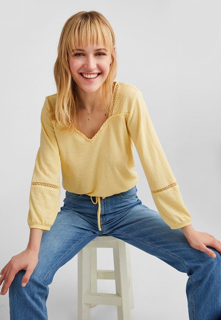 • Bayan Sarı Dantel Detaylı Uzun Kollu Bluz