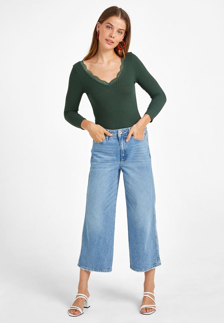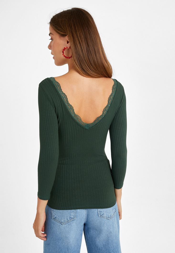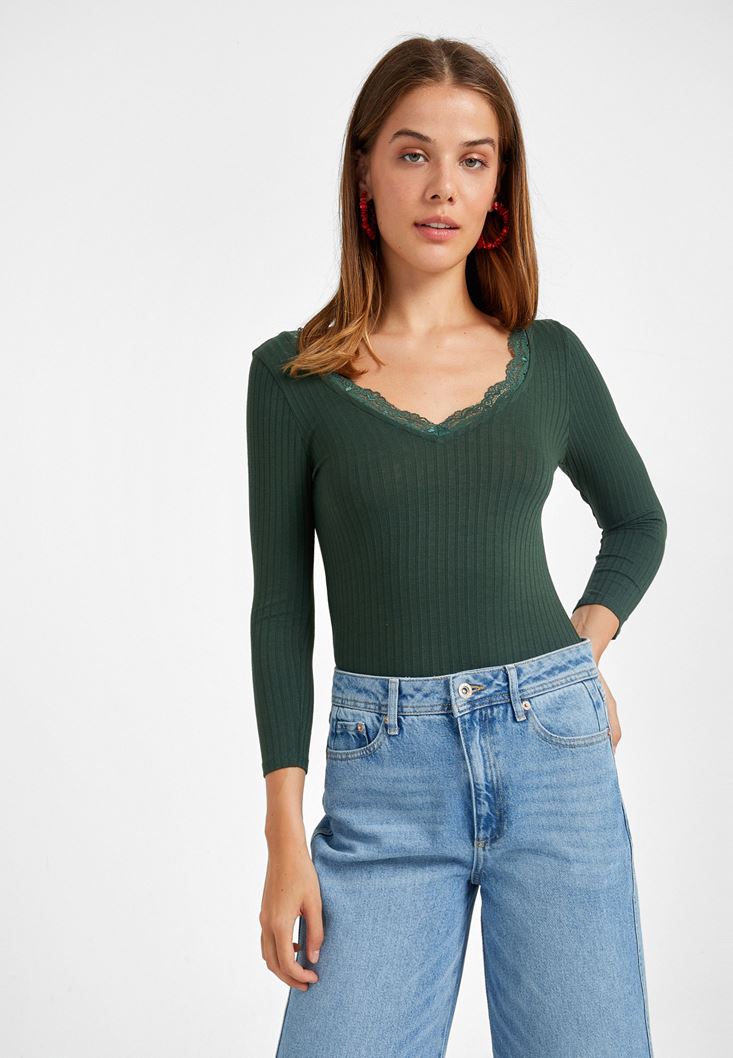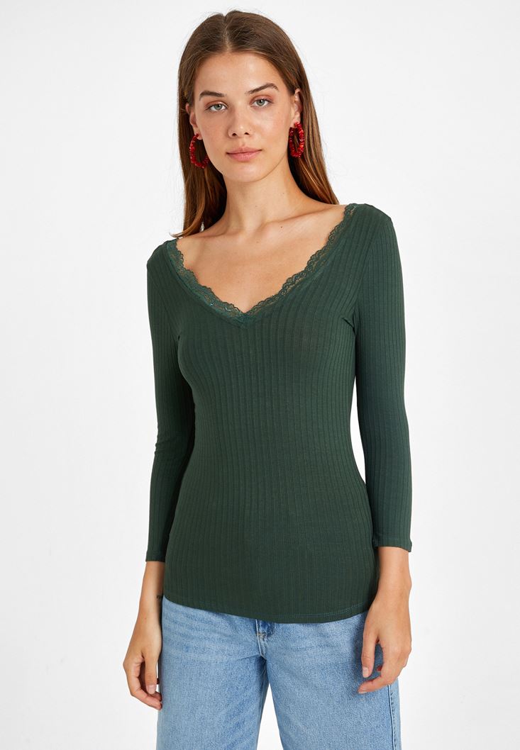• Bayan Yeşil Dantel Detaylı Uzun Kollu Tişört