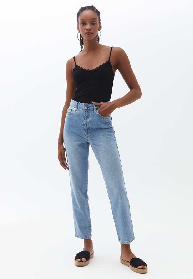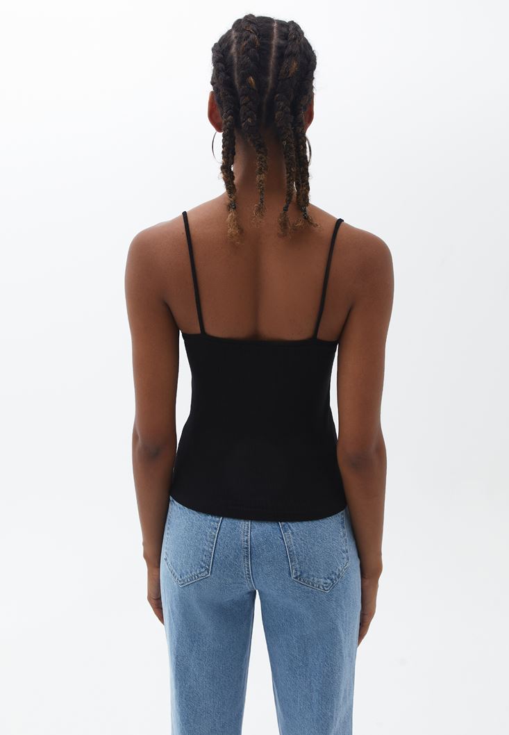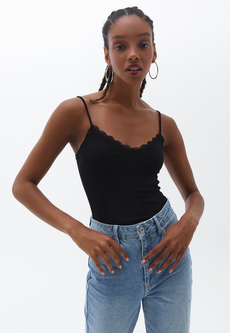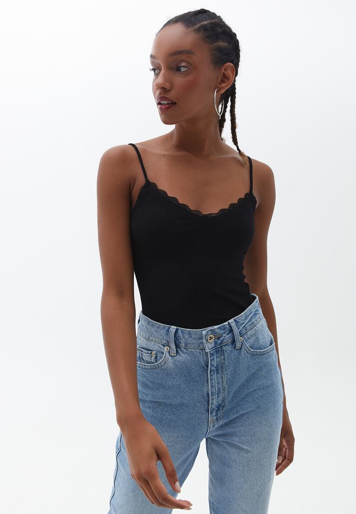Viskon içerikli fitilli doku, ince askılı, V yaka, bedeni saran esnek fit, yakası dantelli, crop kesim.