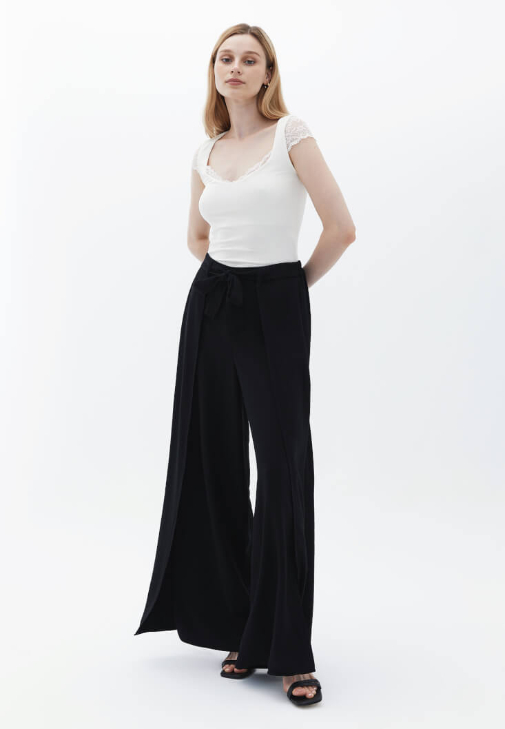 Viskon içerikli doku, geniş V yaka, kısa kollu, yakası ve kol kısmı dantel detaylı, bedeni saran esnek fit.