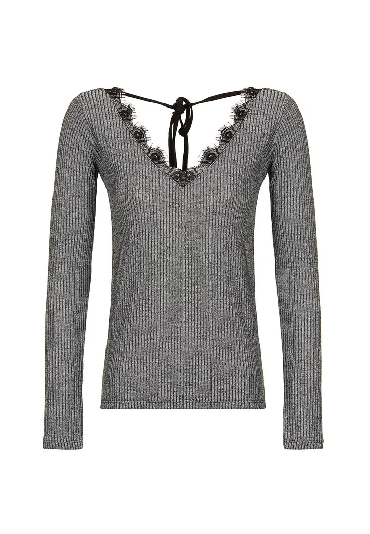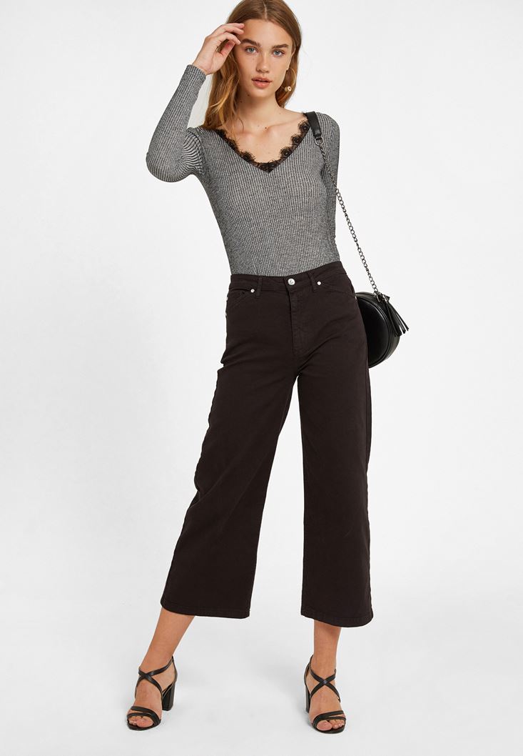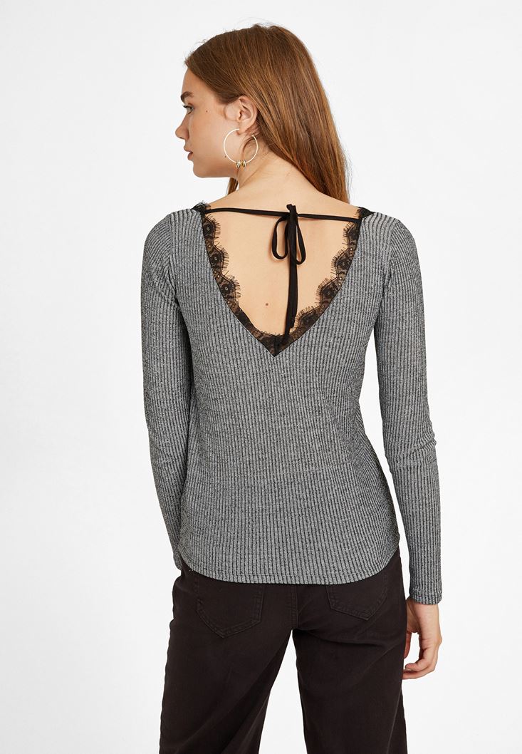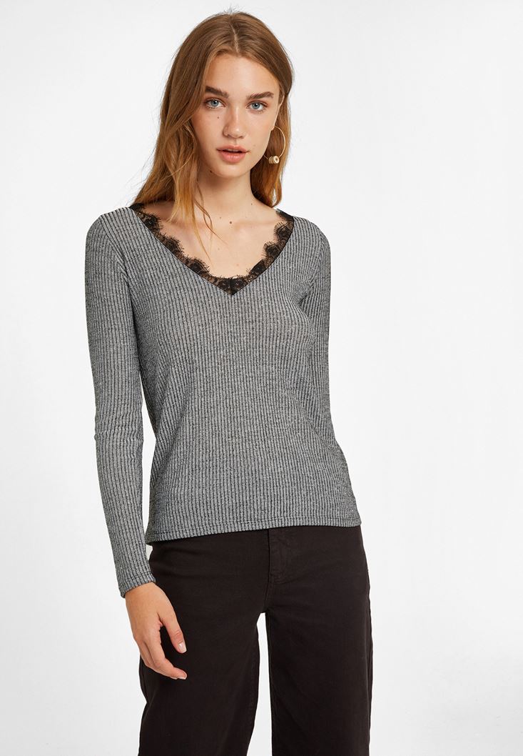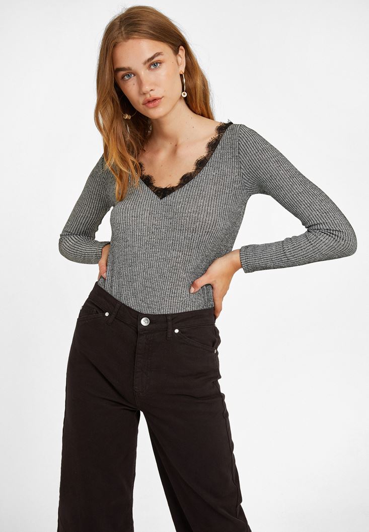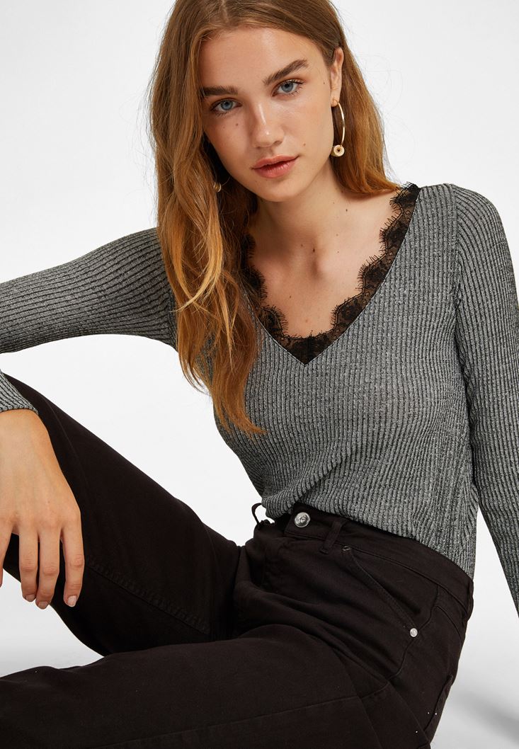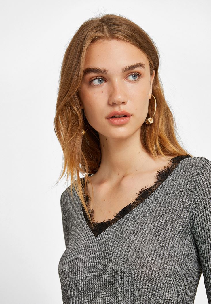 Gri Dantel Detaylı V Yaka Kazak