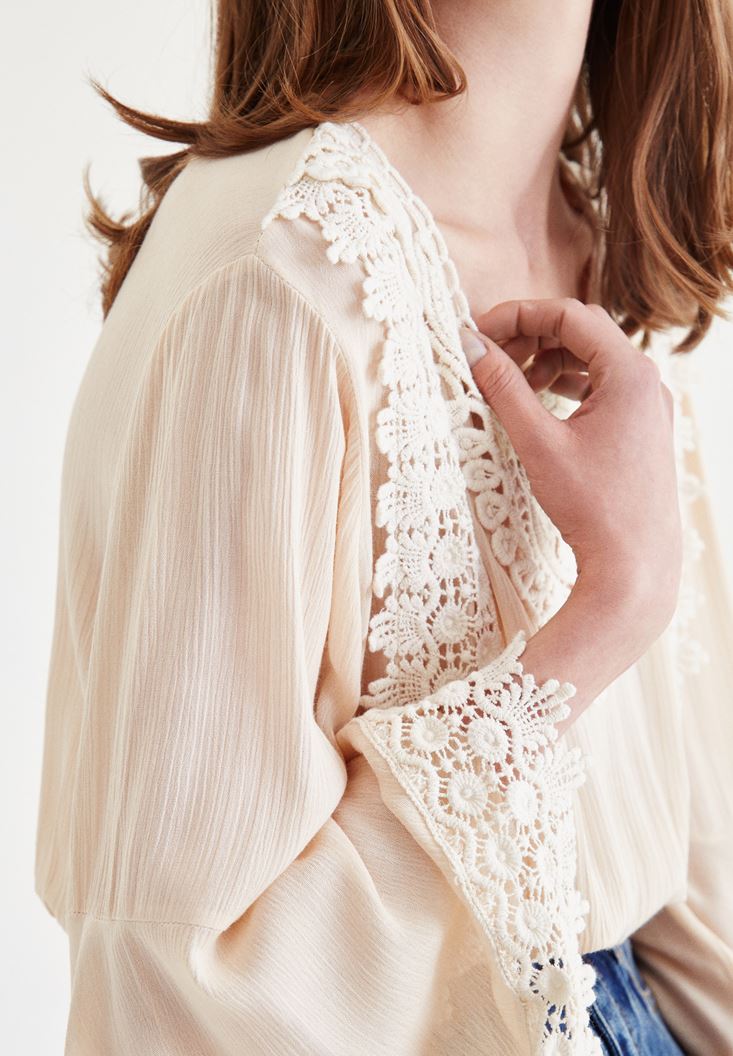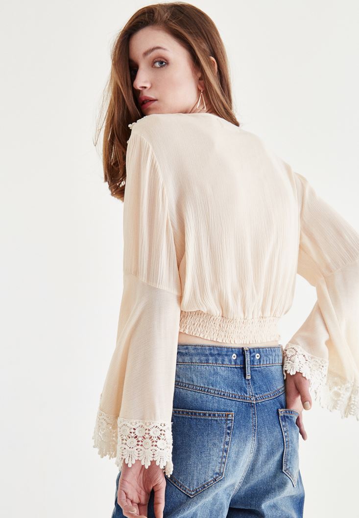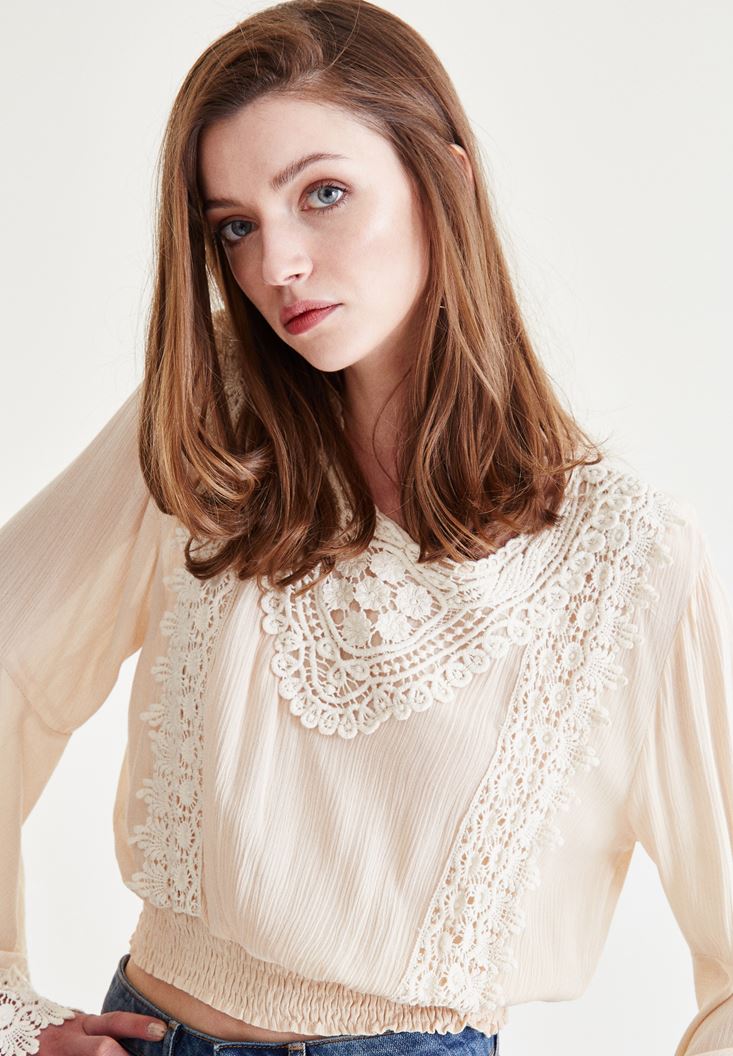 • Bayan Krem Dantel İşlemeli Crop Bluz