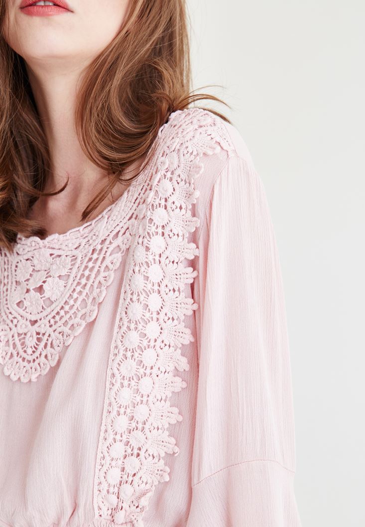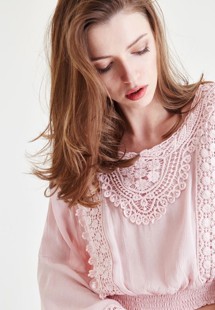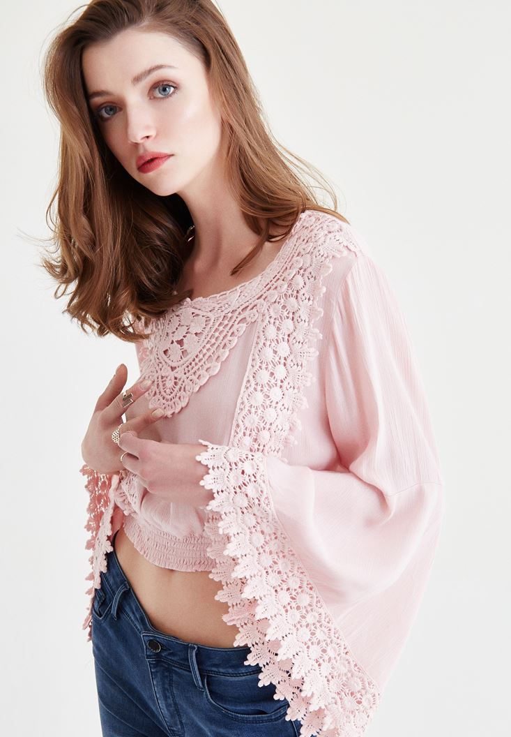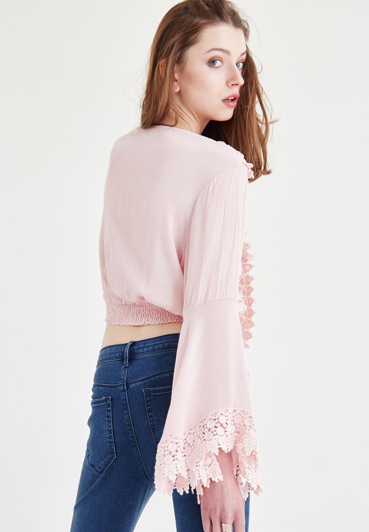 • Bayan Pembe Dantel İşlemeli Crop Bluz
