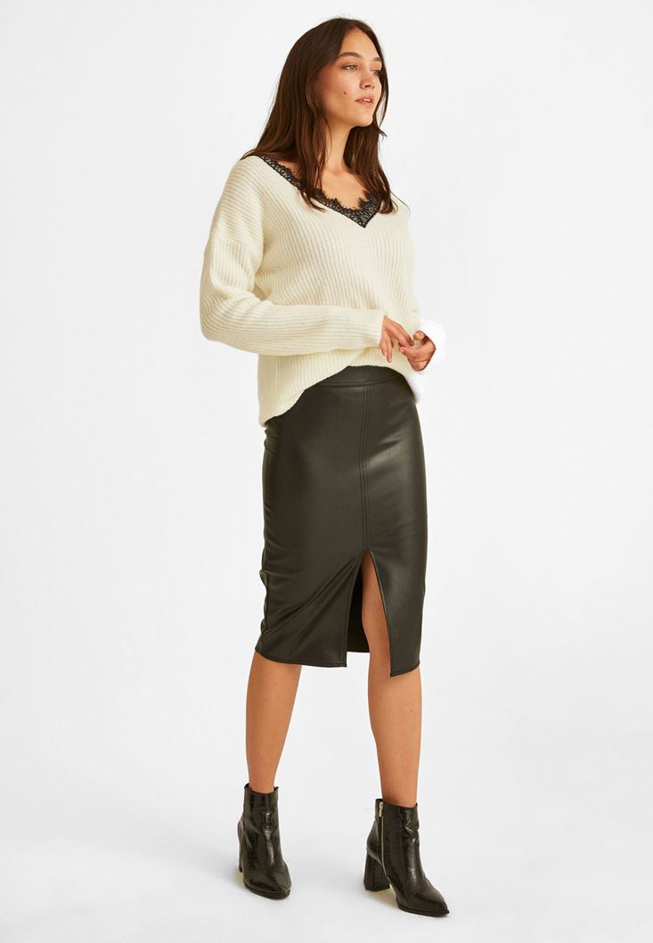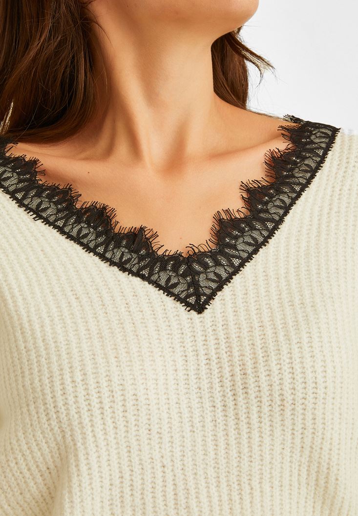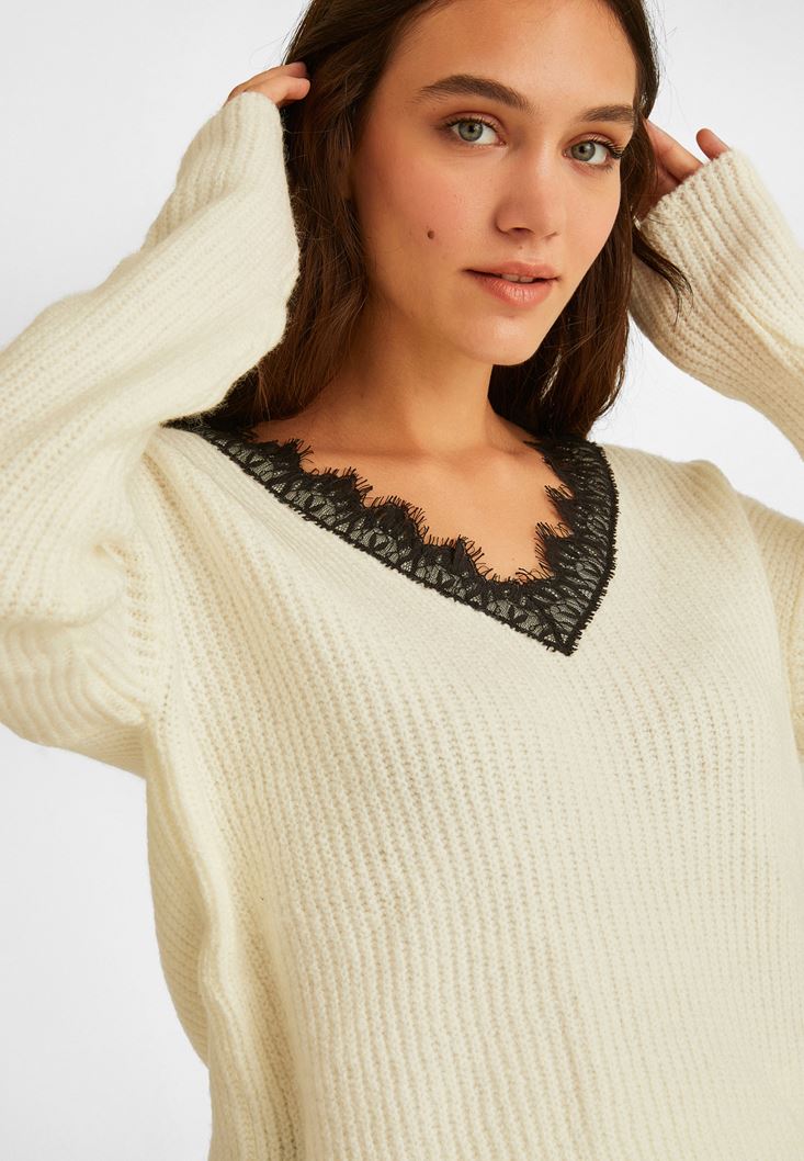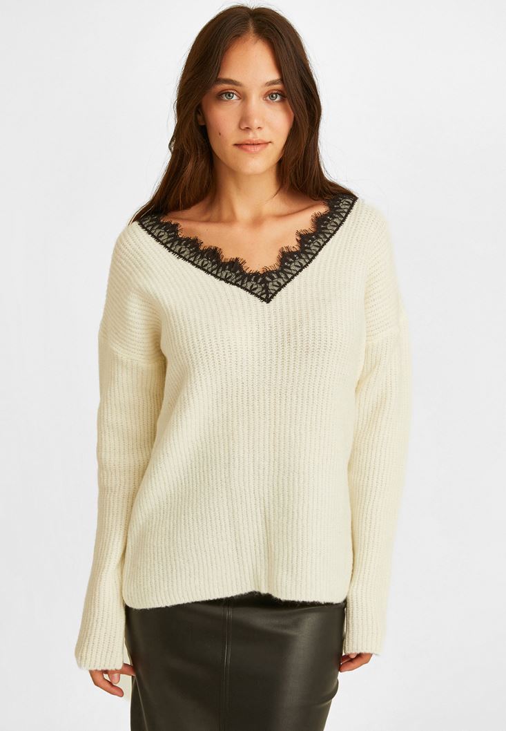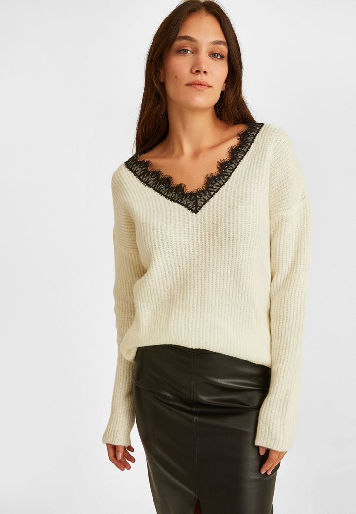Dantel V Yaka Triko modeli, yumuşacık dokusu ve fitilli örgü tasarımı ile tüm şıklığını sizlere sunuyor. kadın triko modeli, önü ve arkası V yaka olan mükemmel tasarımı ile hoş bir görünüm sergiliyor. V yaka tasarımında bulunan dantel ayrıntısı ile göz kamaştıran triko kazak modeli sayesinde oluşturacağınız stillerle farklılık yaratabilirsiniz. kadın triko kazak modeli ile Oxxo midi boy kalem etek tasarımları tercih ederek, benzersiz tarzlar elde edebilirsiniz. Topuklu bot veya uzun çizme ile tamamlayacağınız triko kazak kombininize, şık deri ceket modelleri ekleyebilirsiniz. Oxxo'nun sizleri üstün şıklıkla buluşturan kadın triko kazak modelleri ile eşi benzeri olmayan stillere ulaşabilmenin keyfini sonuna kadar çıkarabilirsiniz.