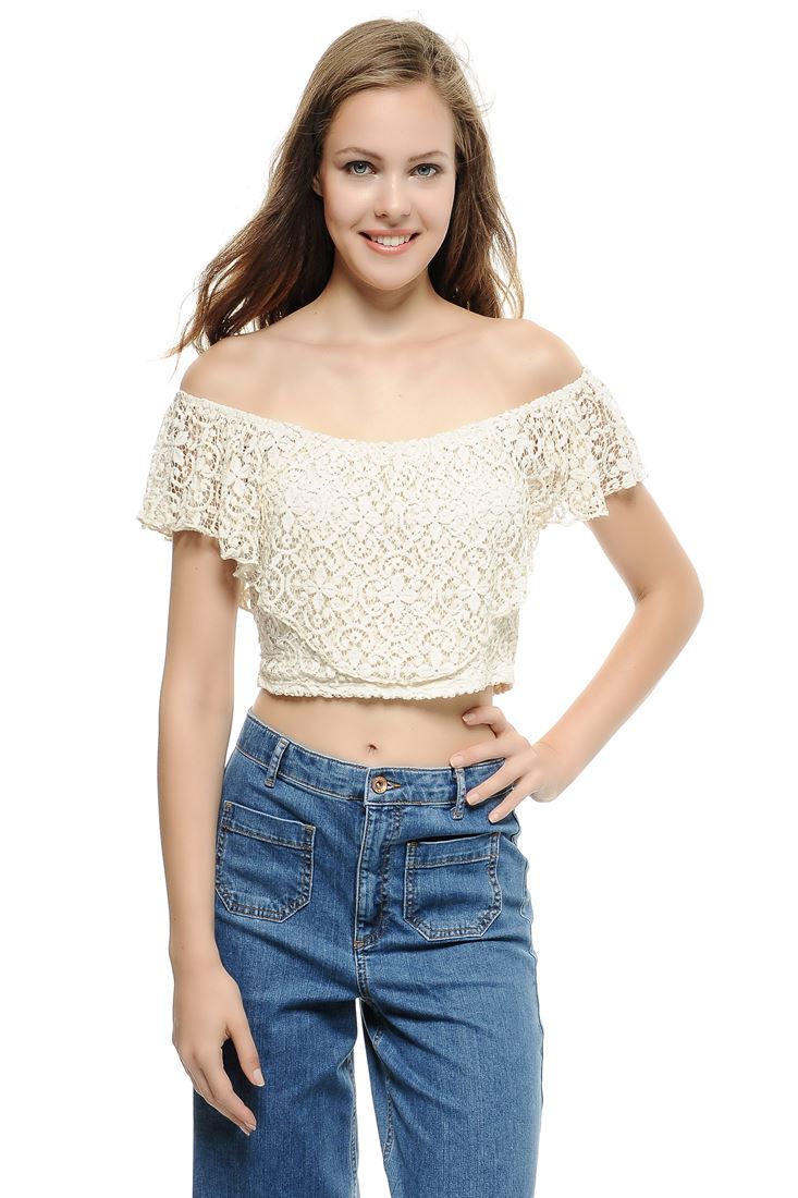 • Bayan Krem Dantelli Kısa Bluz