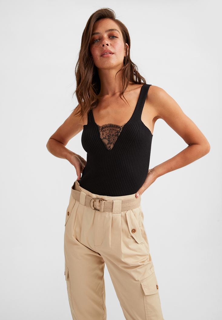 • Bayan Siyah Dantelli V Yaka Triko Bluz