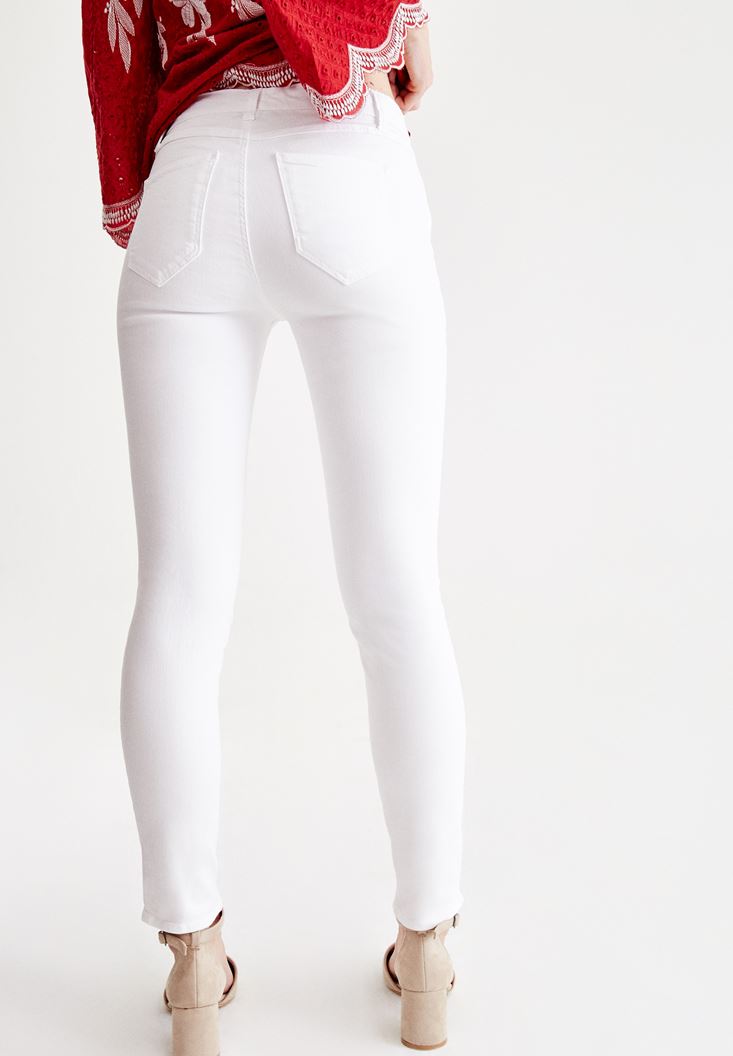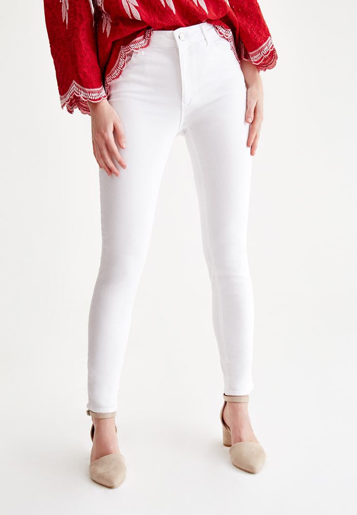 • Bayan Beyaz Dar Paça Orta Bel Pantolon
