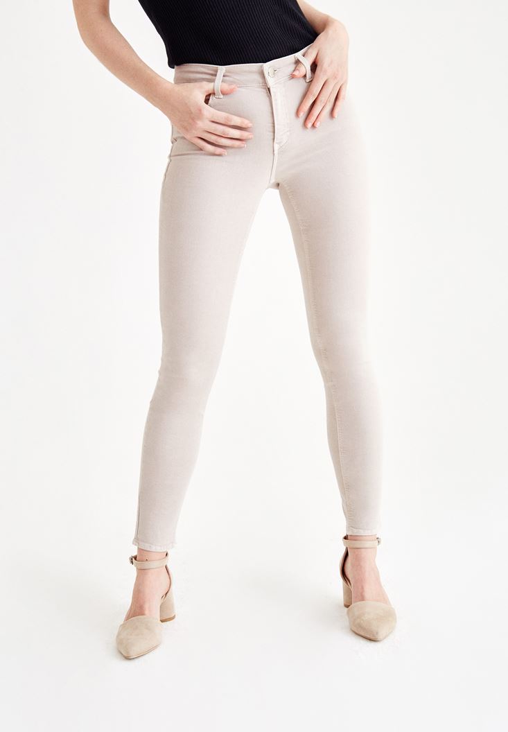 • Bayan Krem Dar Paça Orta Bel Pantolon