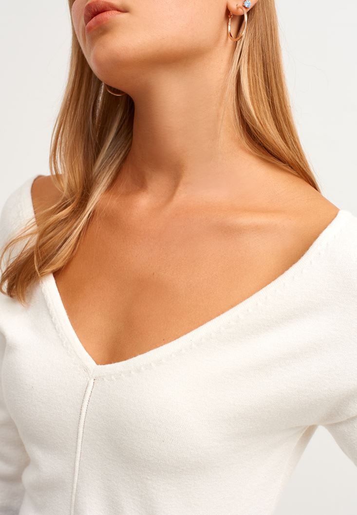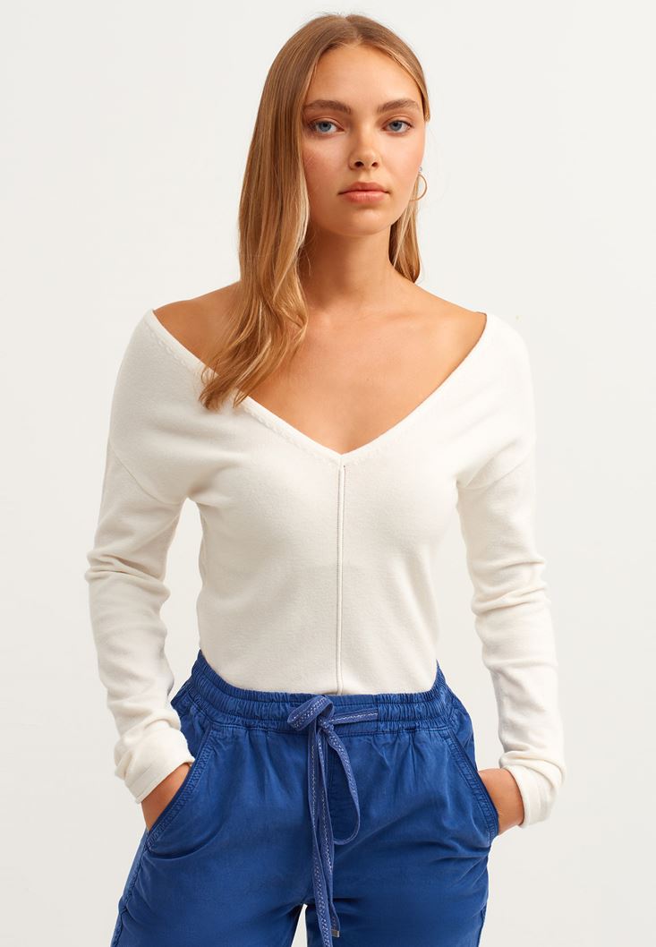 Yumuşacık dokulu bu parçanın bedene yakın kalıbı ile rahatlığı ve zarifliği aynı anda yakalaman mümkün! Ön kısmının yanı sıra sırt bölümünde de bulunan derin V görünüm sayesinde yoğun iş günlerine farklılık katabilirsin. :) Triko modeli ile oluşturacağın kombinlere zincirli bir kolyeyi veya renkli fularları dahil ederek enerjini yükseltebilirsin...