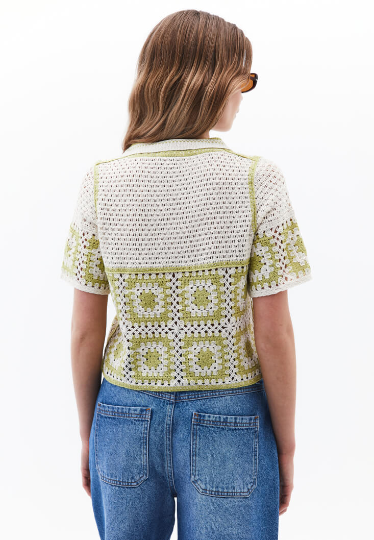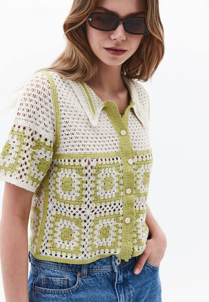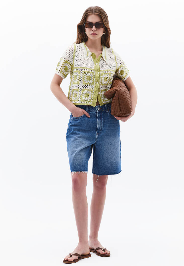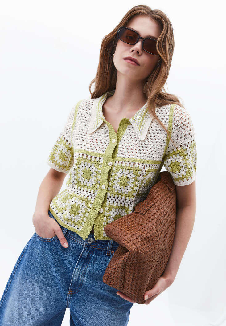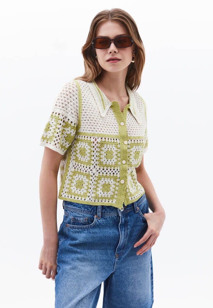 • Bayan Çok Renkli Desenli Crop Gömlek