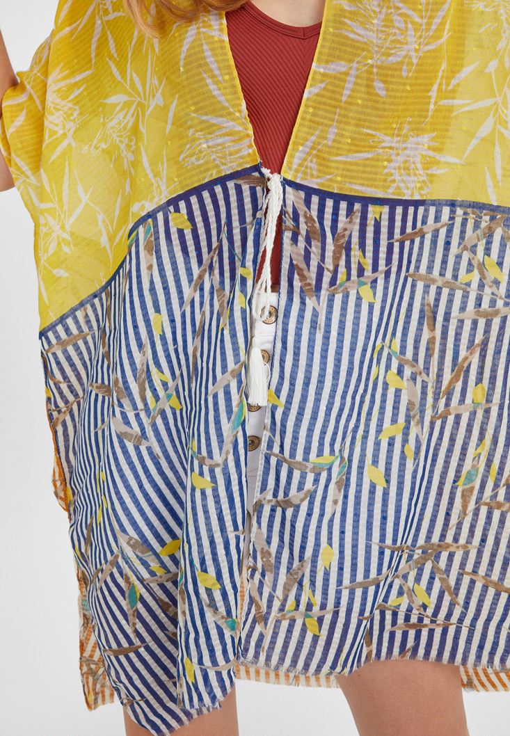 Renkli Desenli Kimono modeli, hafif kumaşı ve yumuşacık dokusuyla yeni sezonda sizlerle buluşuyor. kadın kimono modeli, naif yaprak desenleriyle buluşan çizgi detayların ihtişamını sizlere en iyi şekilde sunuyor. Desenli kimono modeli, salaş görünümün yanı sıra önünde bulunan püsküllü bağlama detayıyla da oldukça göz alıcı ve şık görünüyor. Bahar ve yaz aylarında mini şort ve crop atlet modelleri ile oluşturacağınız kombinlerinizde kadın kimono modelini rahatlıkla tercih edebilirsiniz. Desenli kimono modelini, plaj veya havuz kenarında olduğunuz zamanlarda mayo ve bikini modelleri üzerinde kolaylıkla kullanabilirsiniz. Oxxo'nun dikkat çeken ayrıntıların mükemmel uyumunu sizlere sunduğu kadın kimono modelleri ile fark yaratan kombinler yapabilirsiniz.
