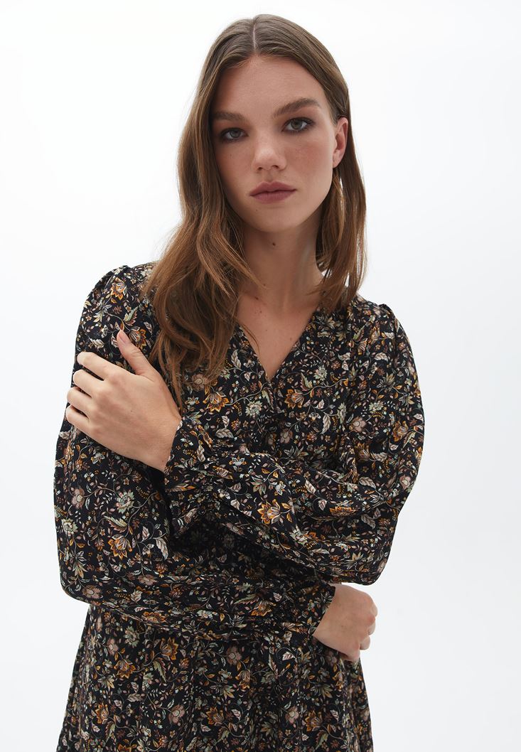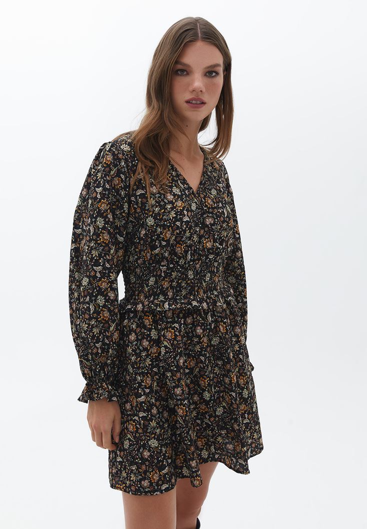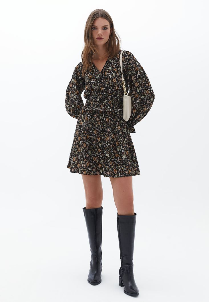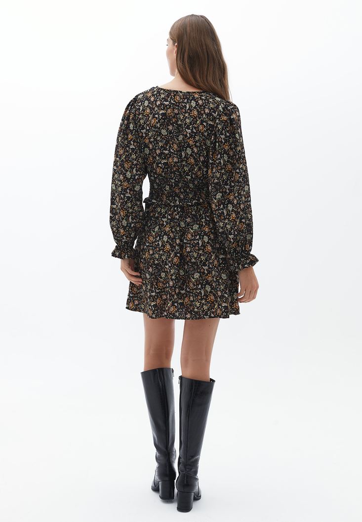 %100 viskon içerikli doku, çiçek desenli, kruvaze yaka, uzun kollu, beli esnek gipeli ve fırfırlı, kol ucu lastikli, mini boy, a kesim etek.