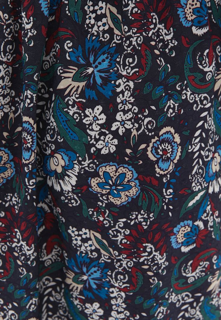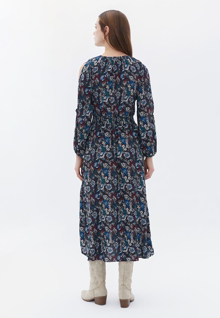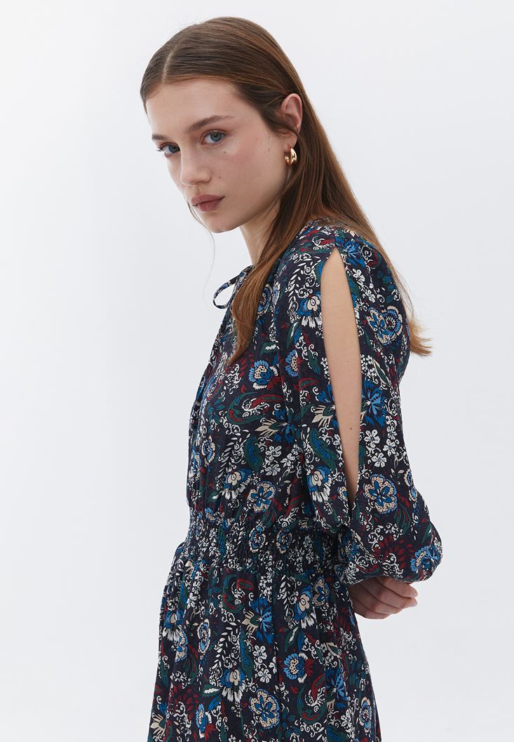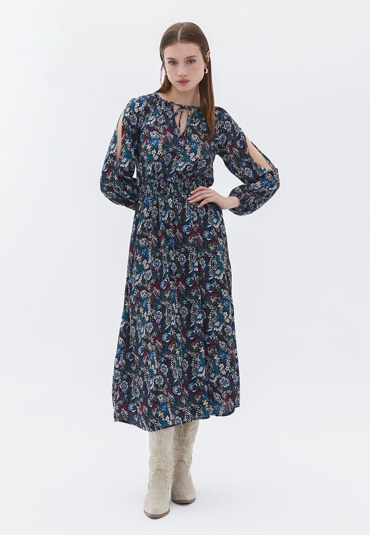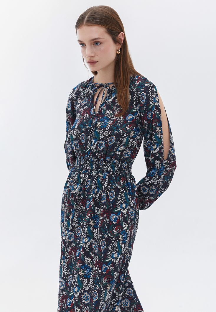 %100 viskon içerikli doku, floral desenli, kol ucu lastikli, beli gipeli, midi boy, kol kısmı cut-out detaylı, yakası bağcıklı, balon kollu.