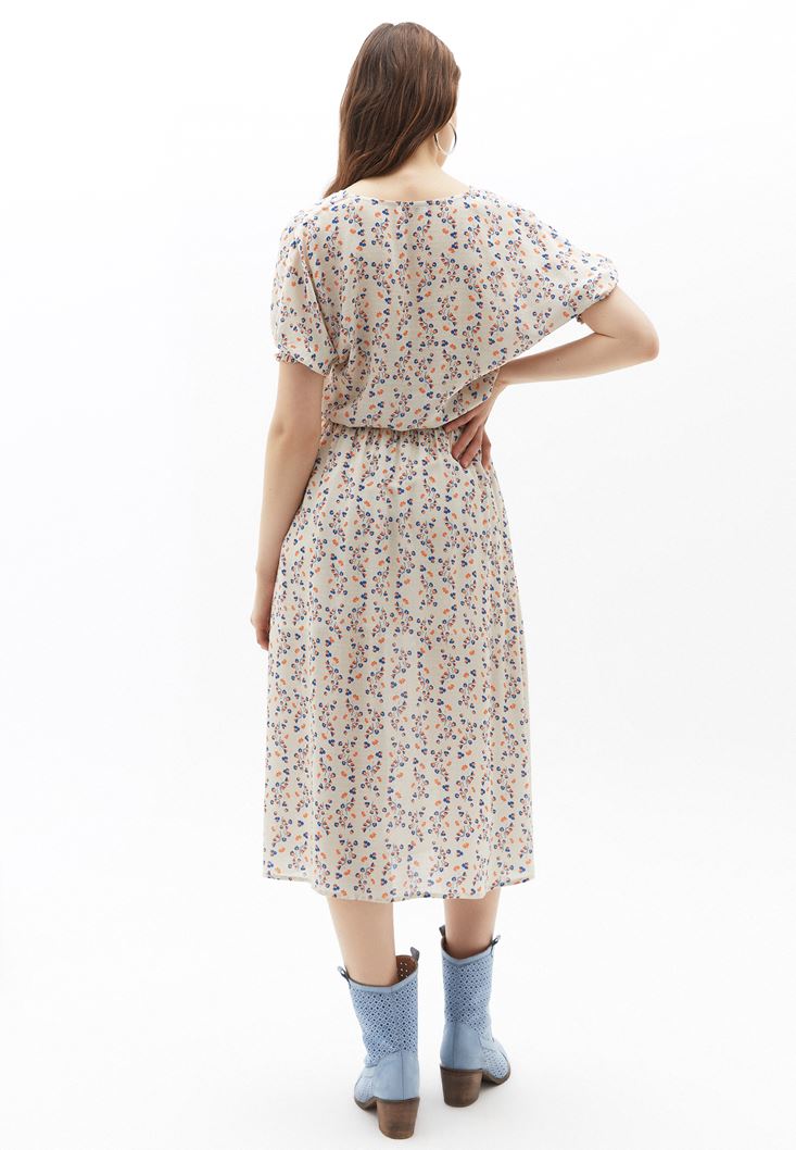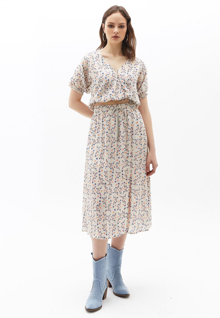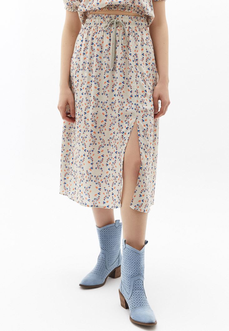 %100 viskon içerikli doku, çiçek desenli, yüksek bel, ön kısmı tek yırtmaçlı, midi boy, beli lastikli ve bağcıklı, a kesim.