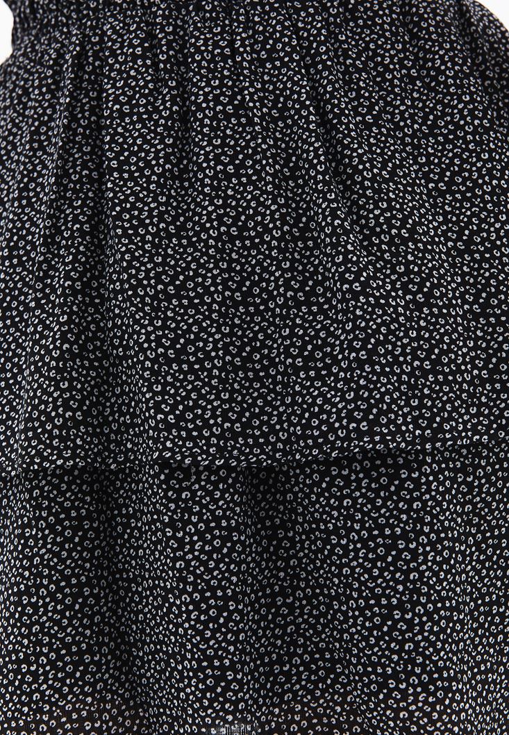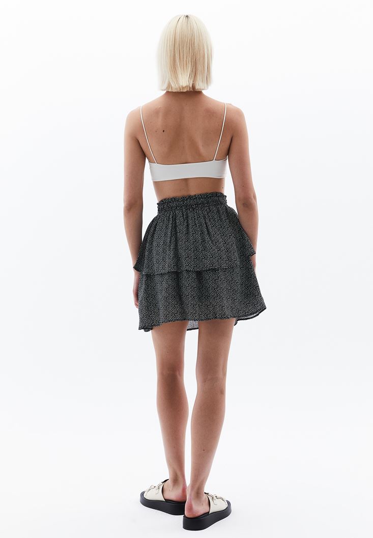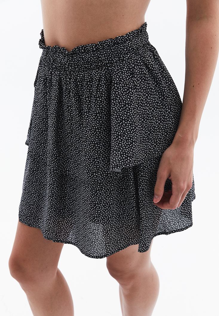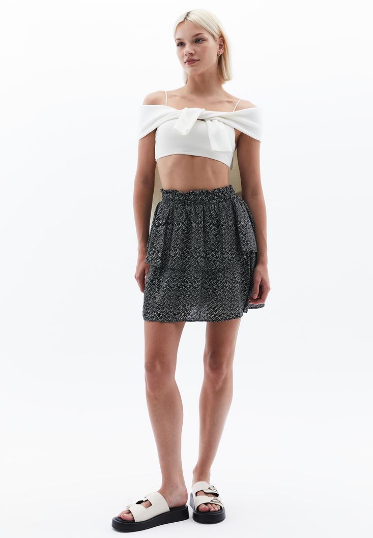 %100 viskon içerikli, yüksek bel, desenli, beli lastikli, mini boy, katlı ve volanlı tasarım, a line fit.