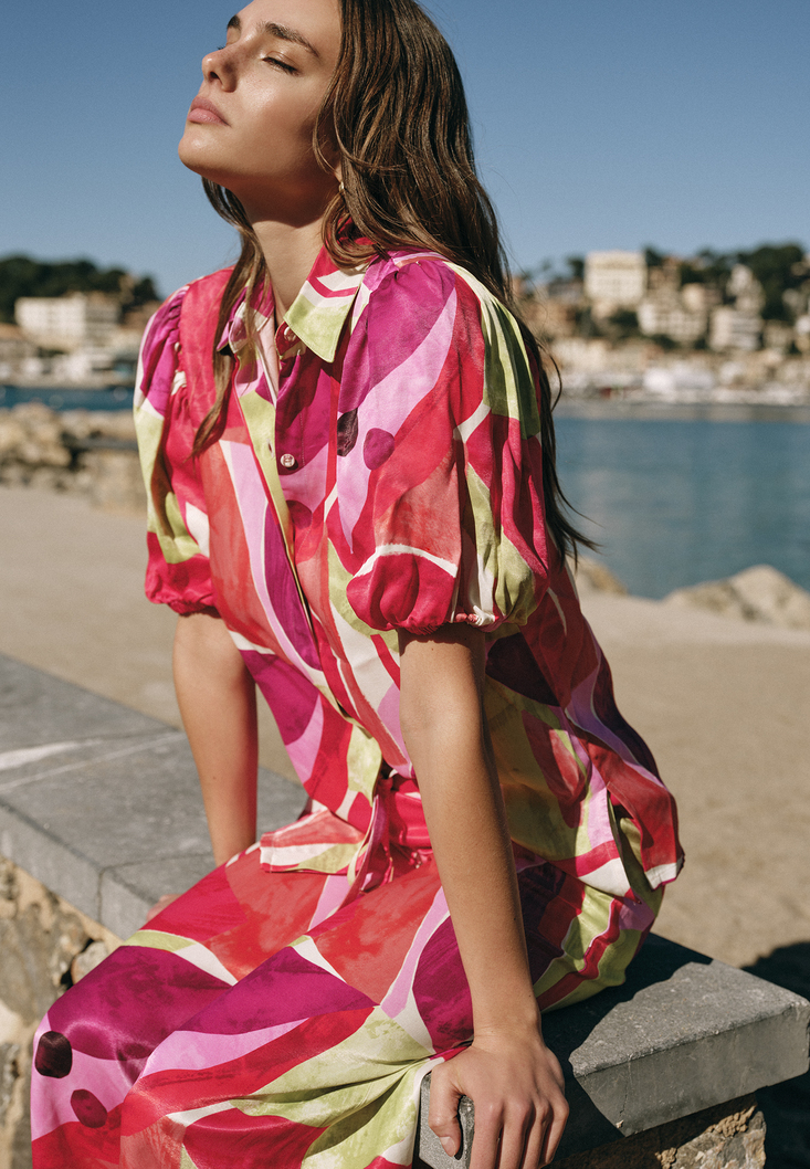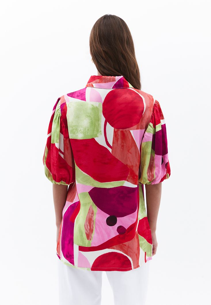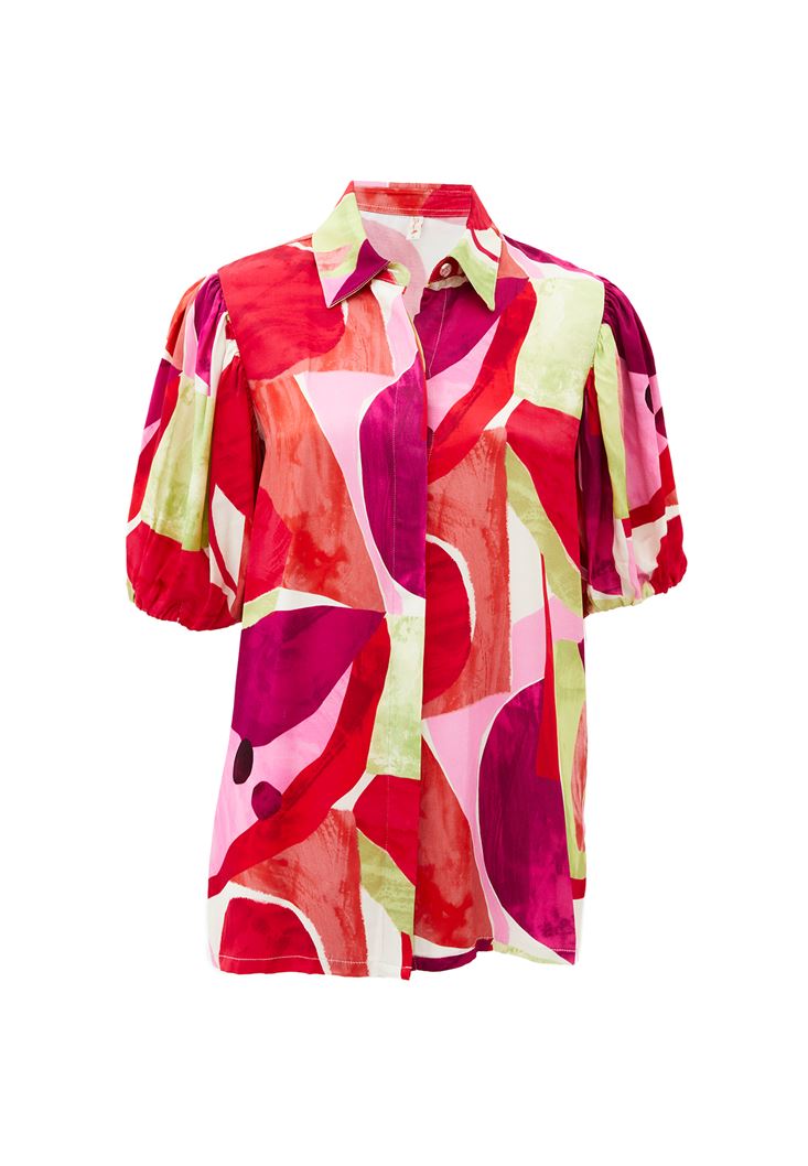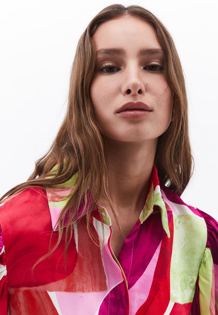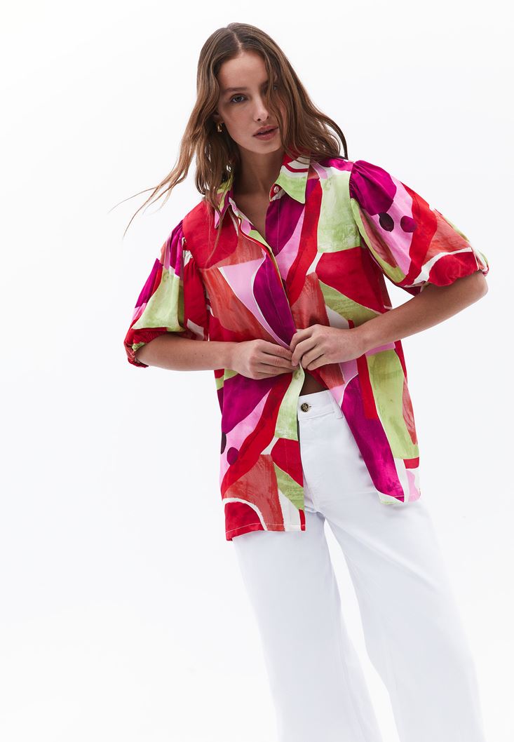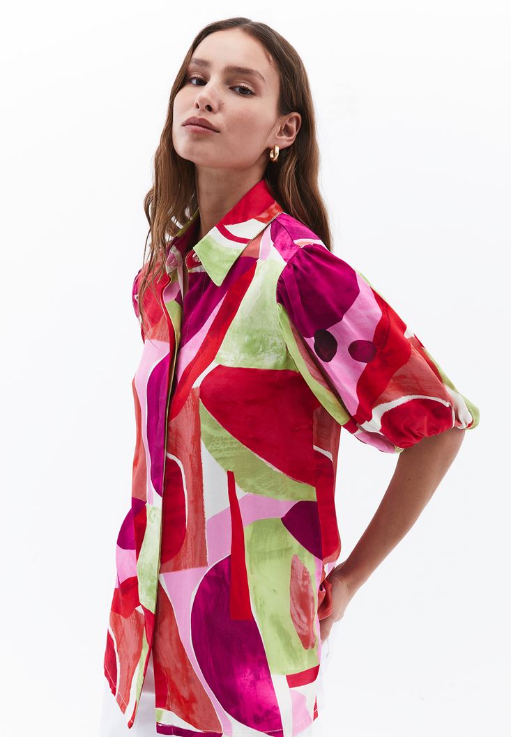 %100 viskon içerikli özel doku, geometrik desenli, bedenden uzak relax fit, kısa kollu, gizli düğme kapamalı, kol ucu lastikli.