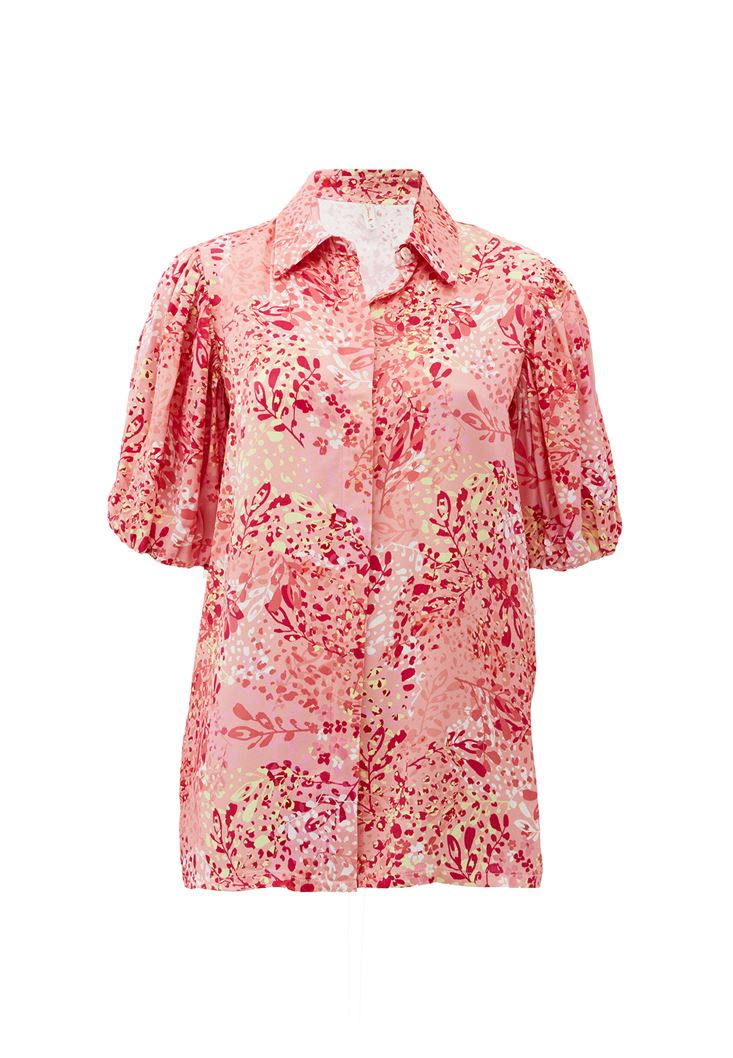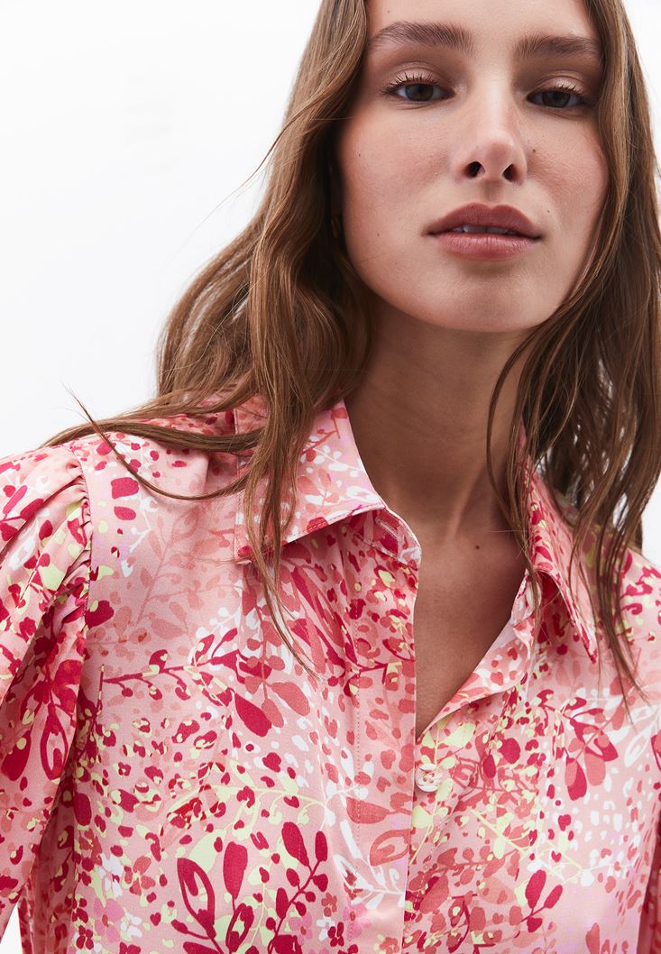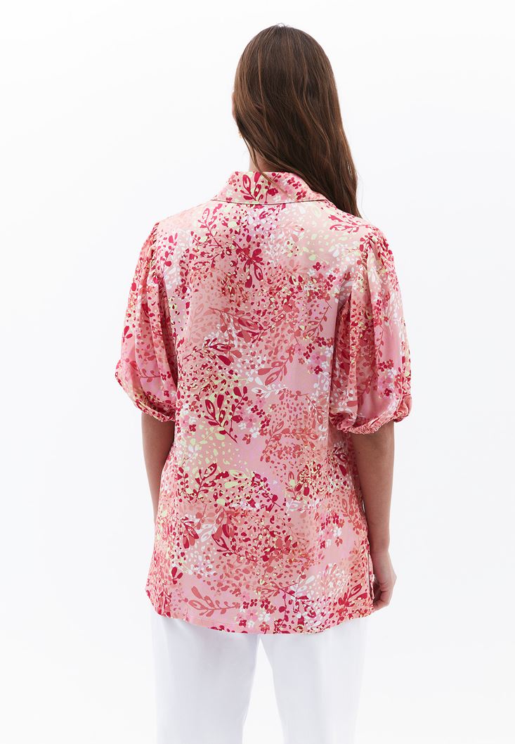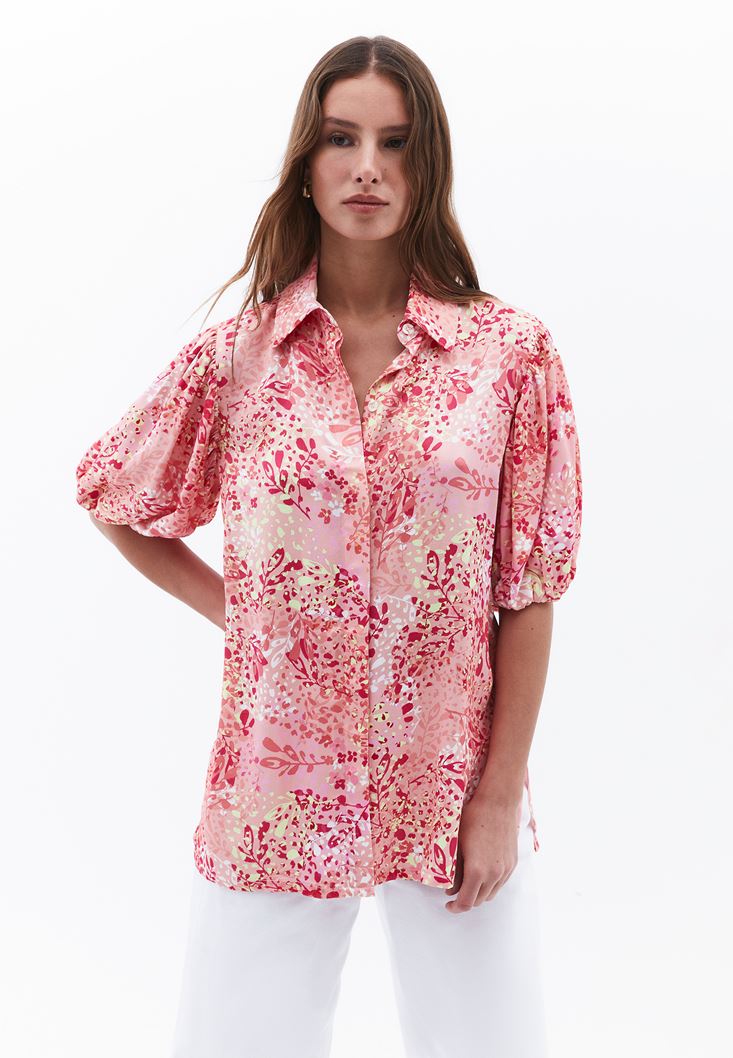 %100 viskon içerikli özel doku, geometrik desenli, bedenden uzak relax fit, kısa kollu, gizli düğme kapamalı, kol ucu lastikli.