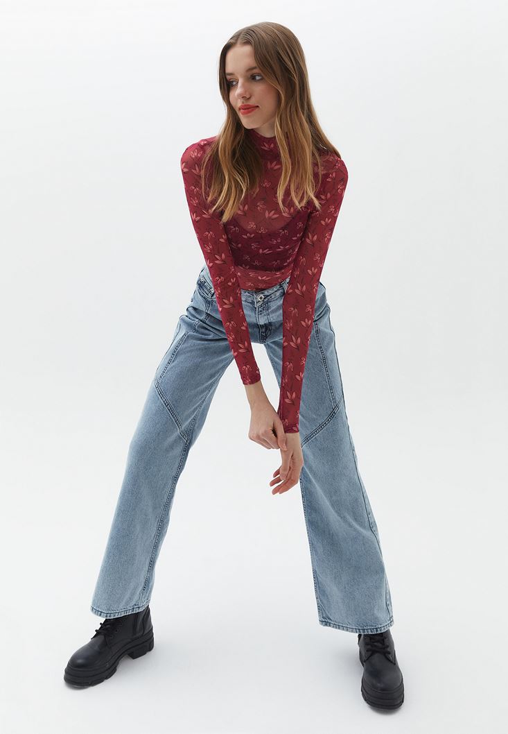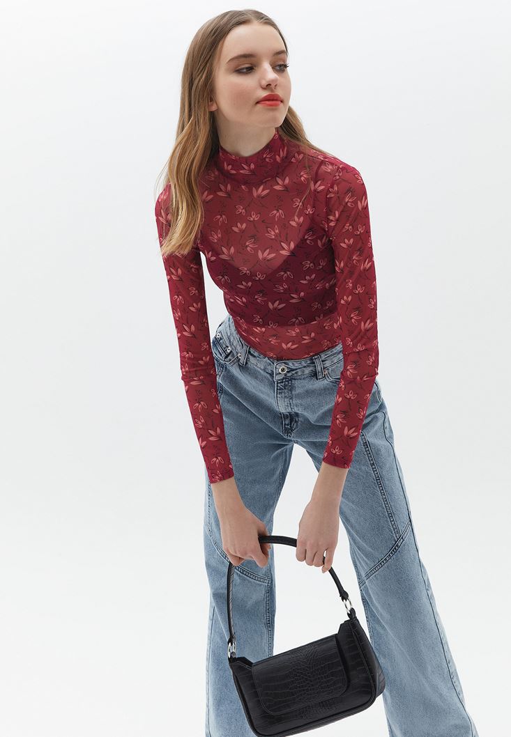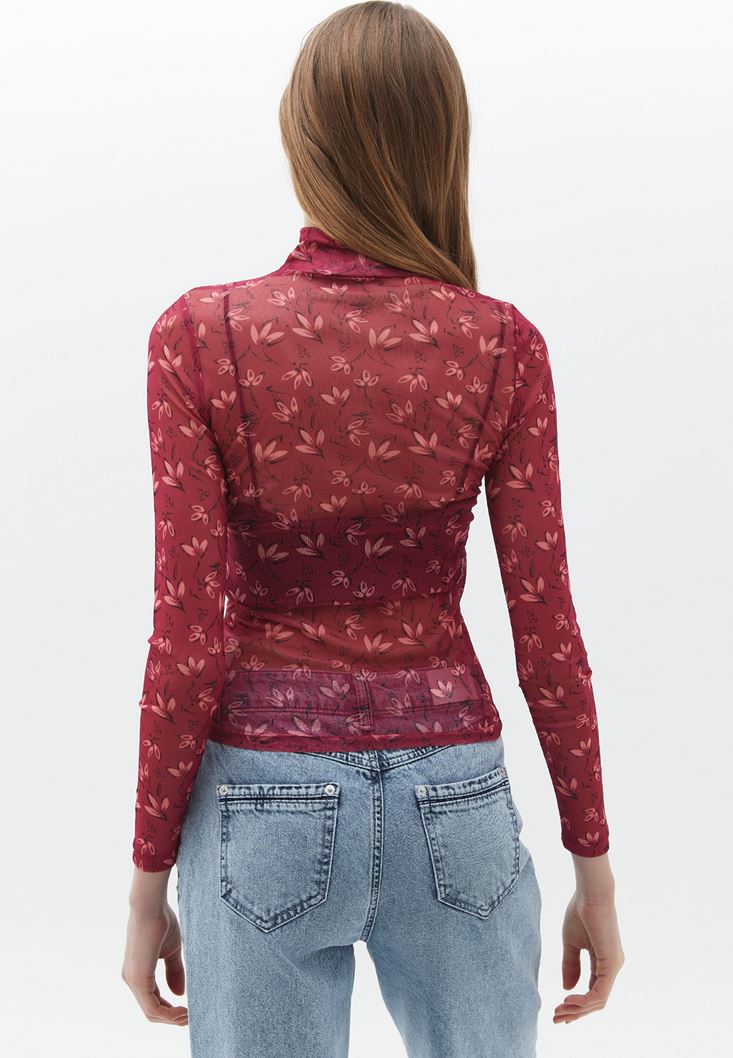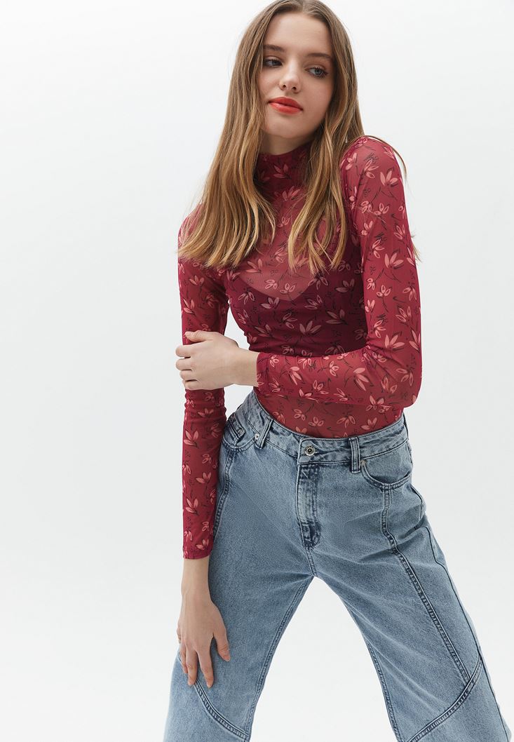 Özel transparan doku, floral desenli, yüksek yaka, bedeni saran esnek kalıp, uzun kollu, standart boy.