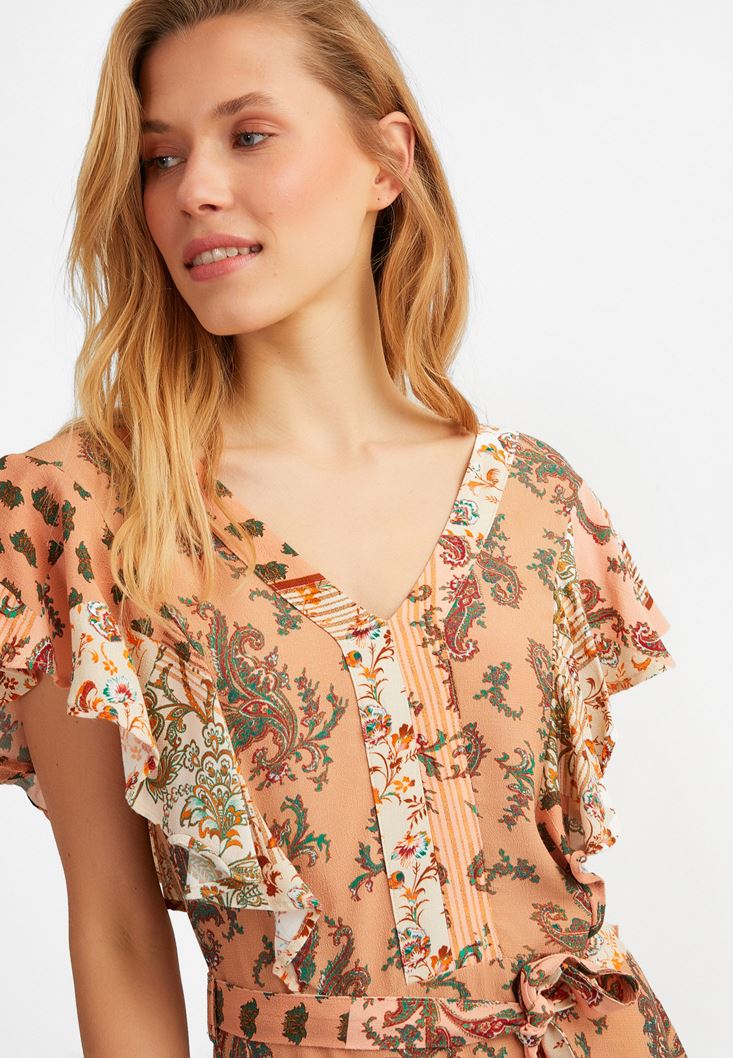 Desenli Uzun Elbise modeli, viskon içerikli yumuşak dokusu ve hareketli detaylarıyla yeni sezonda sizlerle buluşuyor. kadın elbise modeli, kol kısmında yer alan fırfırların yanı sıra önü arkası V şeklindeki görüntüsüyle de oldukça dikkat çekiyor. Desenli uzun elbise modeli, iki yanında bulunan yırtmaçlara ek olarak belinde bulunan kuşak ayrıntısıyla da iddialı bir görünüm sunuyor. Topuklu ayakkabı ve askılı çanta modelleri ile kullanabileceğiniz kadın elbise modeli sayesinde sezon modasına uyum sağlayabilirsiniz. Desenli uzun elbise ile küpe ve kolye modelleri tercih ederek kombinlerinizi güçlendirebilirsiniz. Oxxo'nun enerjik ve hareketli detayları şıklıkla buluşturan kadın elbise modelleri ile stilinize ahenk katabilirsiniz.