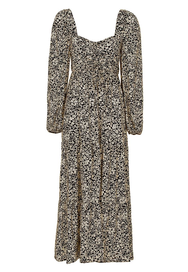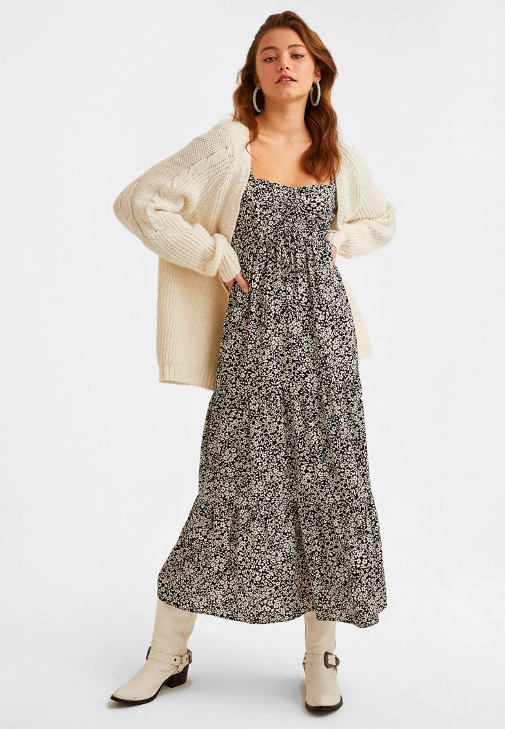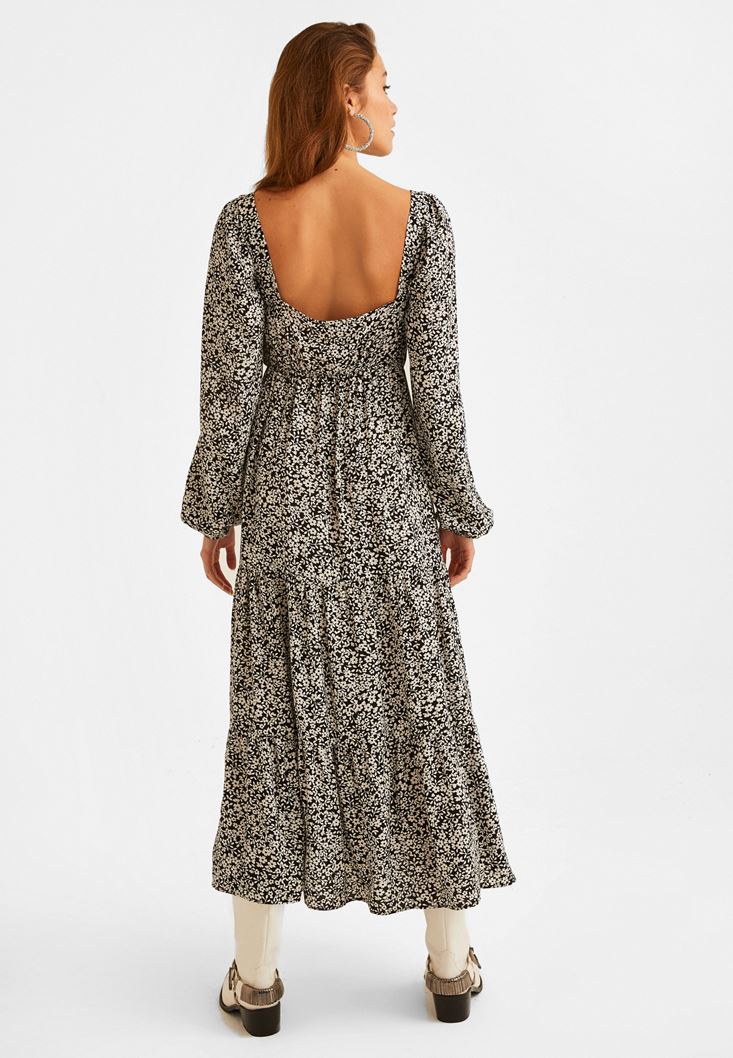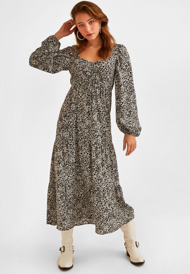 Desenli Uzun Elbise modeli. Mükemmel viskon içerik ve romantik detaylar eşsiz bir şekilde yeni sezonda seninle buluştu. Balon kol ve büzgülü görünümü bir arada yakalayıp, zarif bir duruş elde etmen mümkün! Özel günlerini veya günlük kombinlerini uzun elbise ile taçlandırmak fazlasıyla etkileyici... Onunla stilini birkaç adım öne taşımak için topuklu terlik ve askılı çanta kullanmak hoş bir fikir.