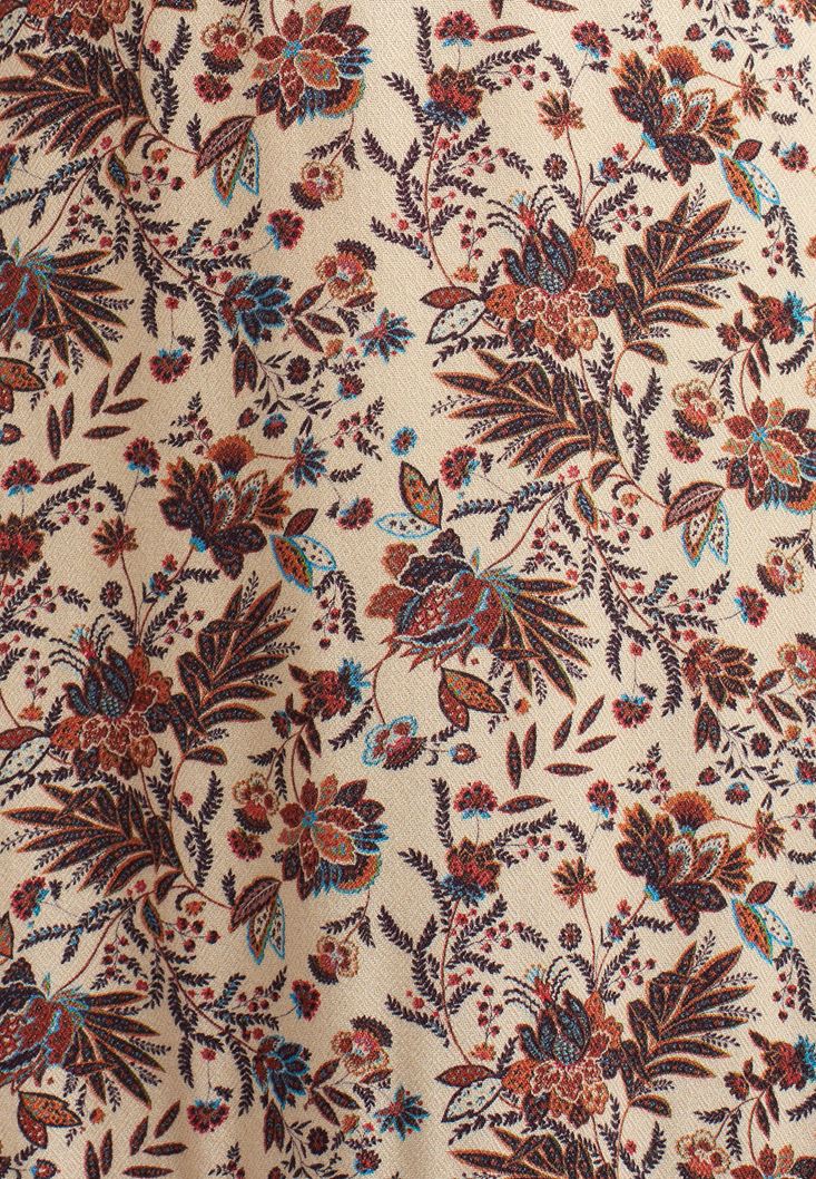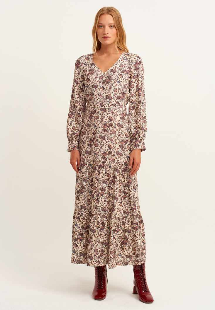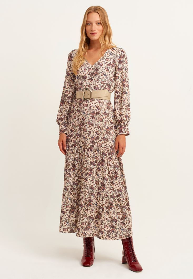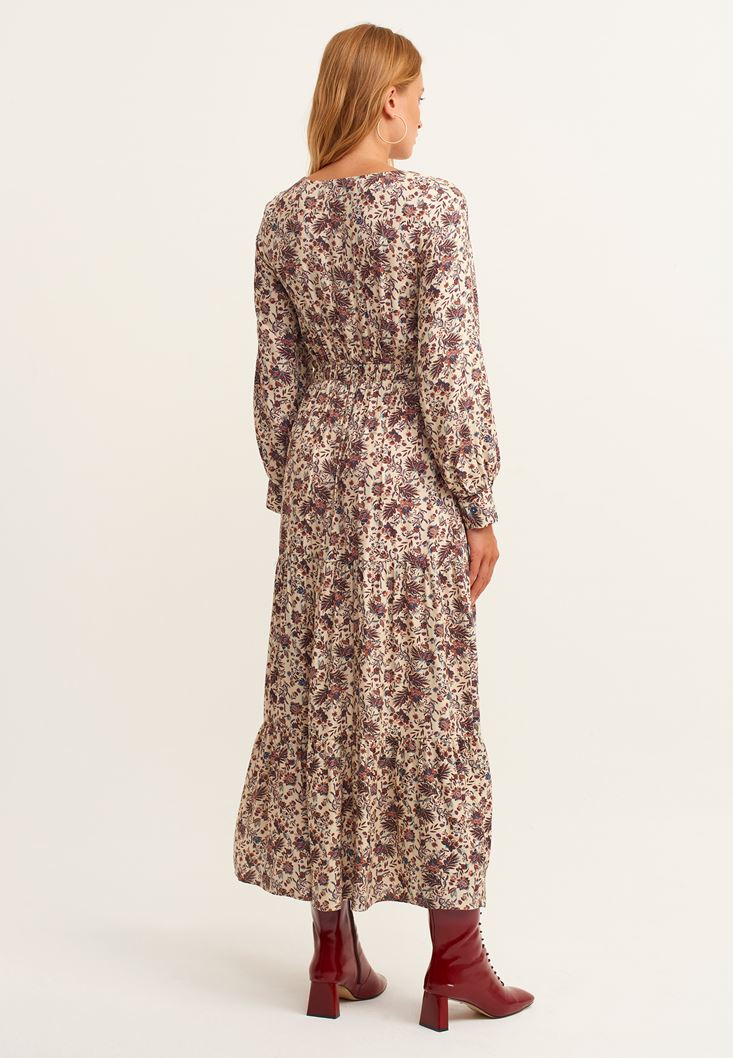 %100 viskon içerikli doku, V yaka, floral desenli, balon kollu, katlı ve volanlı etek tasarımı, arka bel kısmı lastikli.