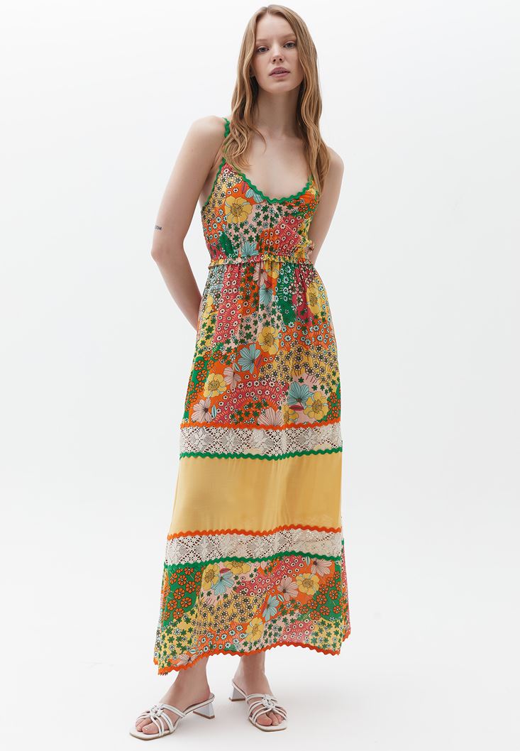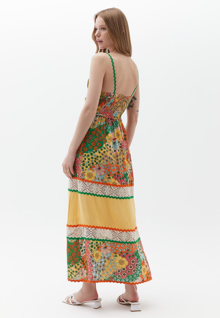 %100 viskon içerikli doku, çiçek desenli, A kesim etek, ince askılı, V yaka, bedene yakın üst kesim, sırt kısmı gipeli, maxi boy.