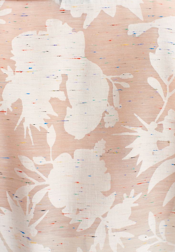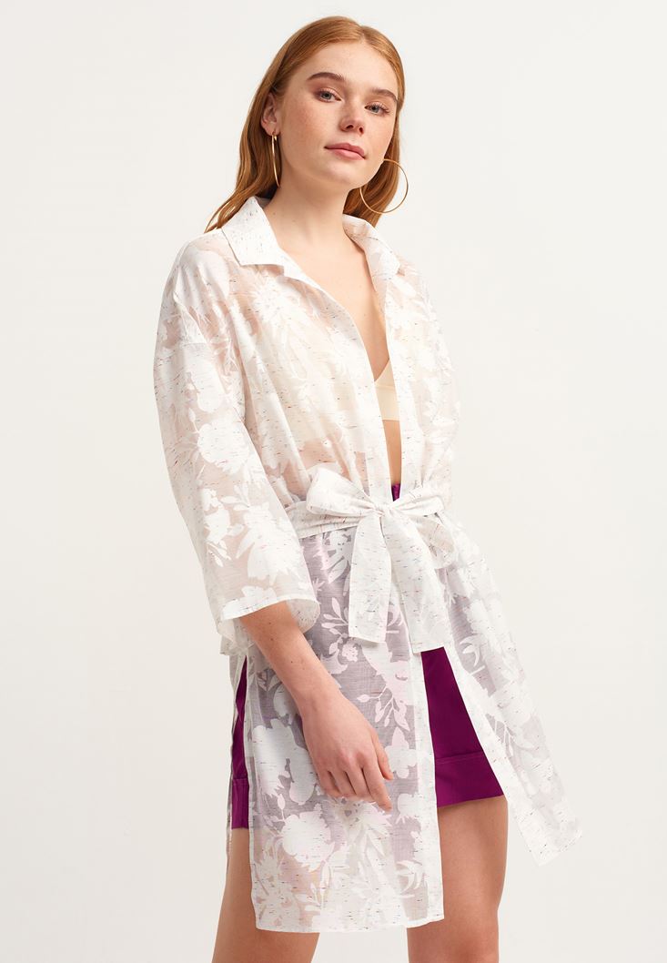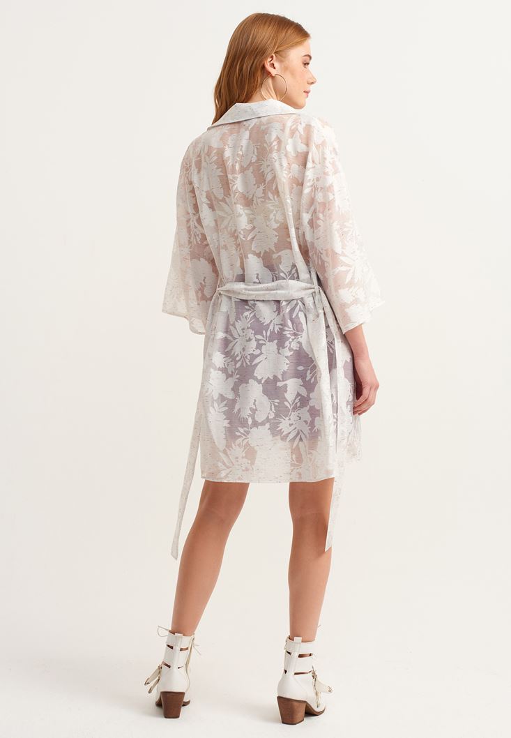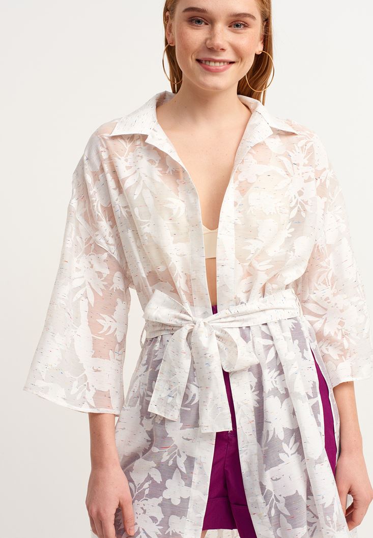 Transparan doku üzerinde çiçek desenleri, kendi kumaşından kuşaklı, gömlek yaka formu, iki yanı yırtmaçlı, geniş kesimli truvakar kol.