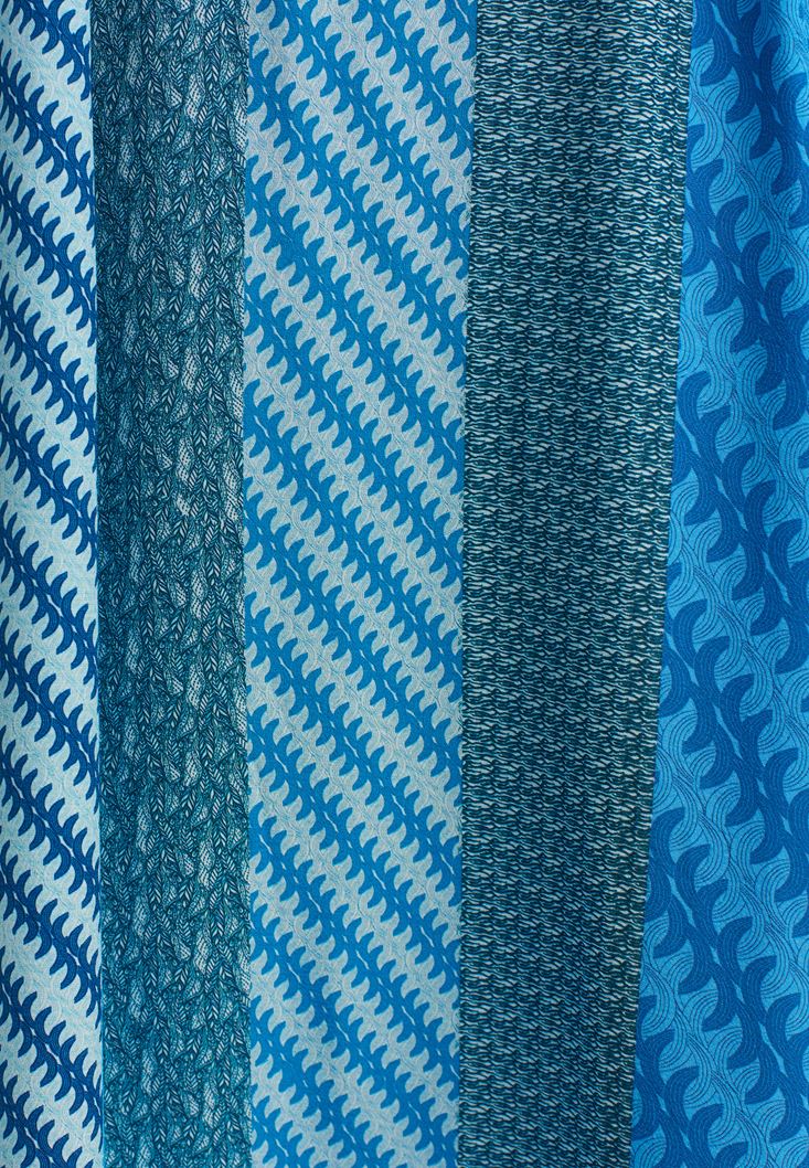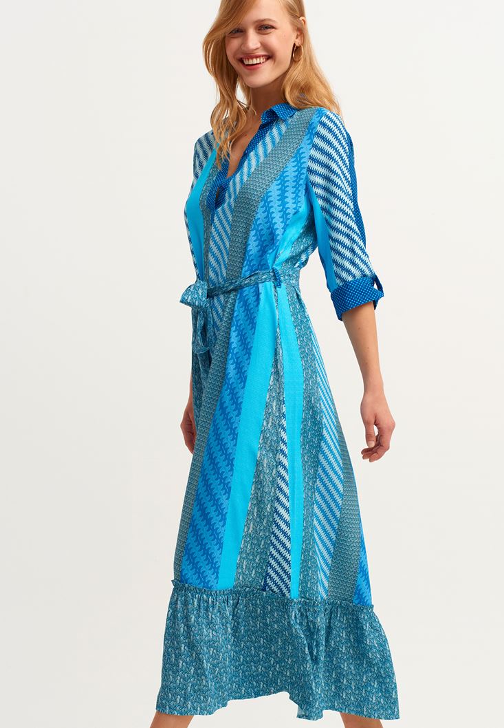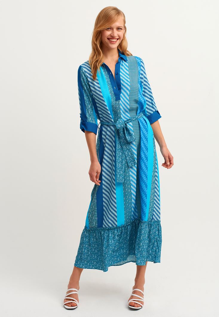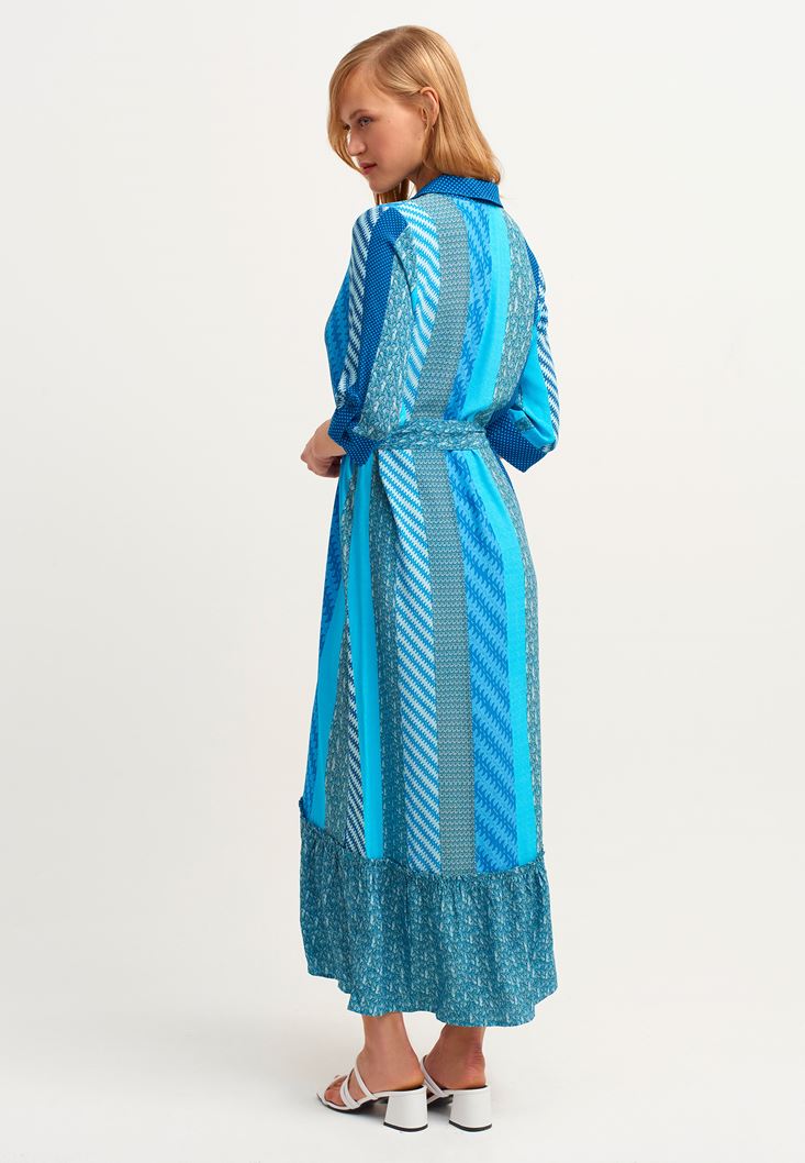 Viskon içerikli yumuşak doku, düğme kapamalı gömlek yaka, etek ucu volanlı, apolet detaylı kol ucu, kendi kumaşından kemerli, mix desenli, maxi boy.