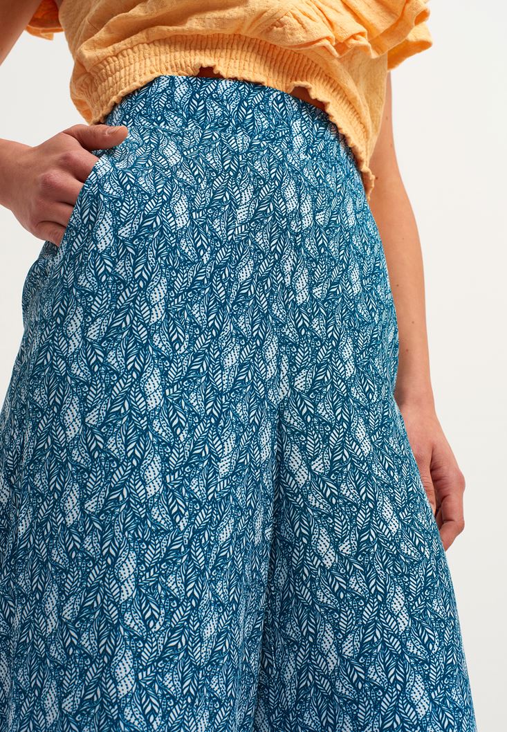 %100 viskon içerikli özel doku, desenli ve beli lastikli, bedenden uzak wide-leg fit, rahatlık sunan ultra yüksek bel, iki yanı cepli.