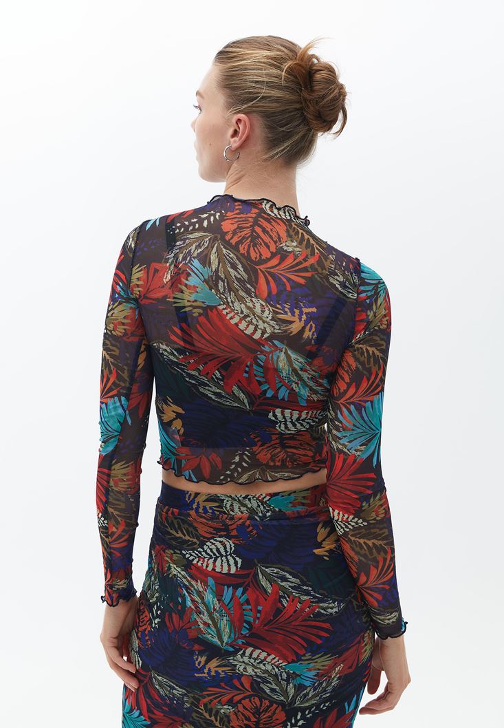 Özel desenli doku, yüksek yaka, bedeni saran fit, crop kesim, uzun kollu.