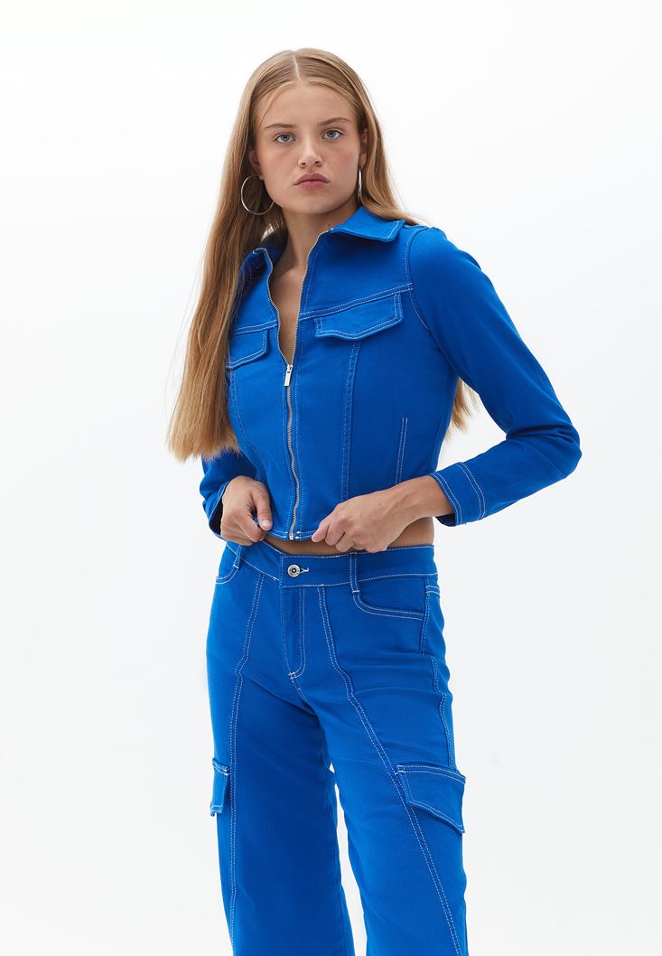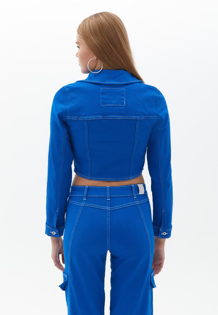 Mavi Dikiş Detaylı Crop Ceket
