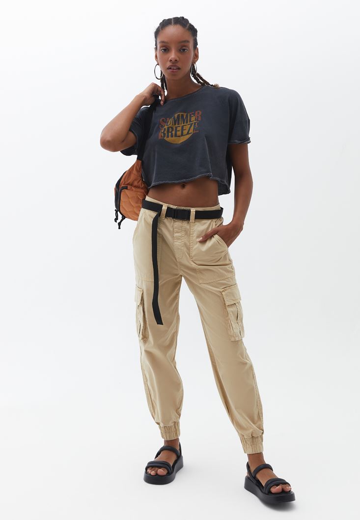 Pamuklu Crop Tişört ve Kemerli Pantolon Kombini
