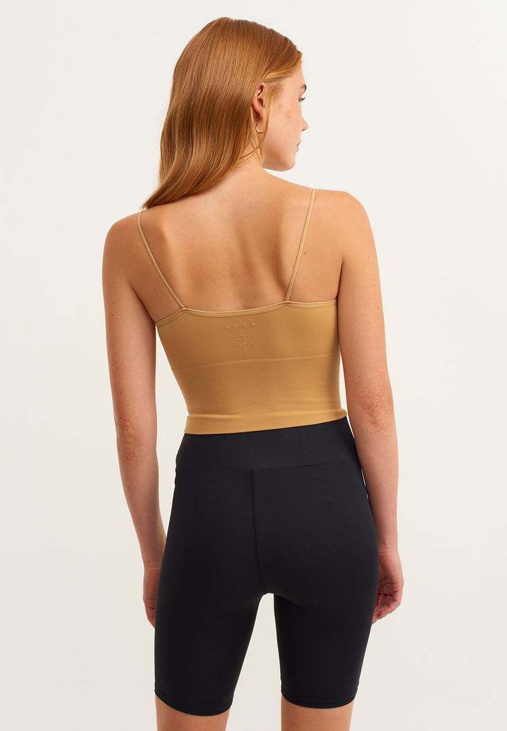 Dikişsiz ekstra esnek doku, bedeni saran rahat fit, ince askılı, v yaka, crop kesim.