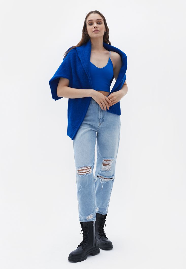 Dikişsiz ekstra esnek doku, bedeni saran rahat fit, ince askılı, v yaka, crop kesim.