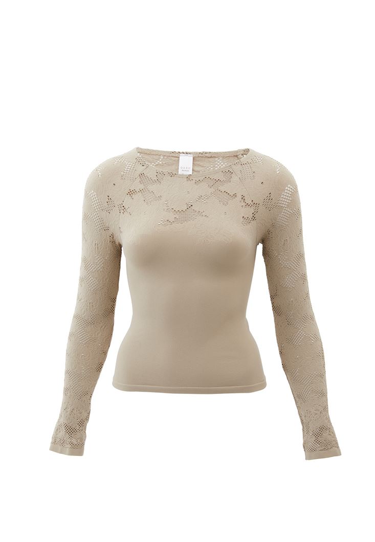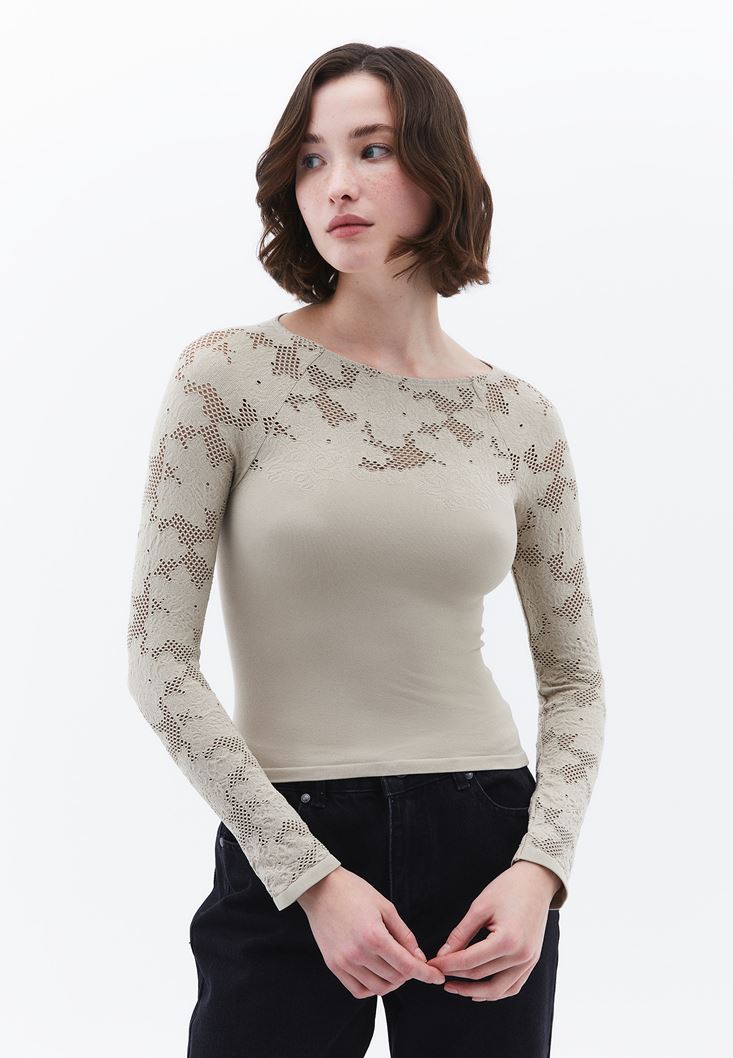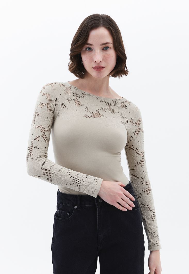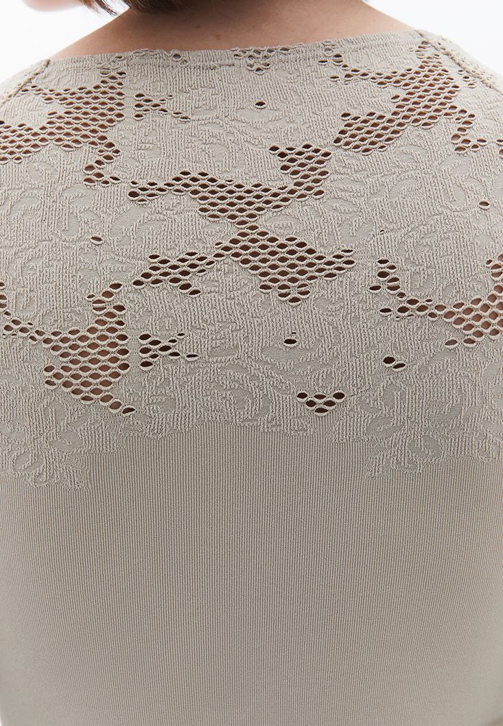 Seamless teknolojisiyle tasarlanmış özel dikişsiz doku, bedeni saran ekstra esnek fit, uzun kollu, bot yaka, kol ve üst beden kısmı dantel görünümlü jakar.