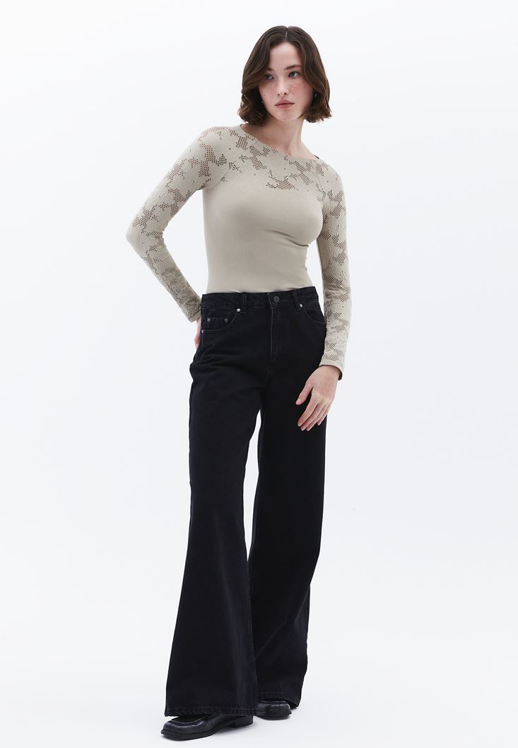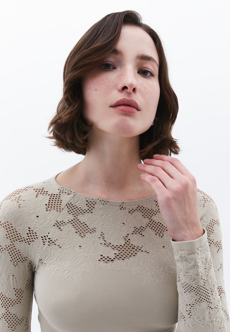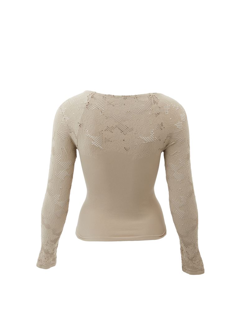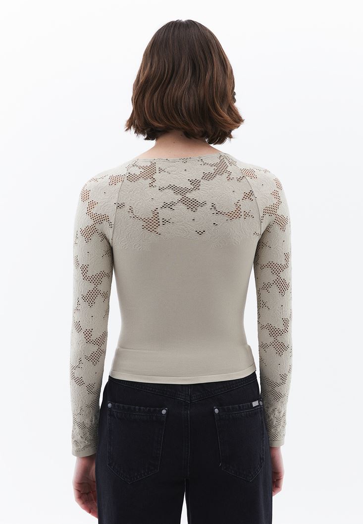 Seamless teknolojisiyle tasarlanmış özel dikişsiz doku, bedeni saran ekstra esnek fit, uzun kollu, bot yaka, kol ve üst beden kısmı dantel görünümlü jakar.