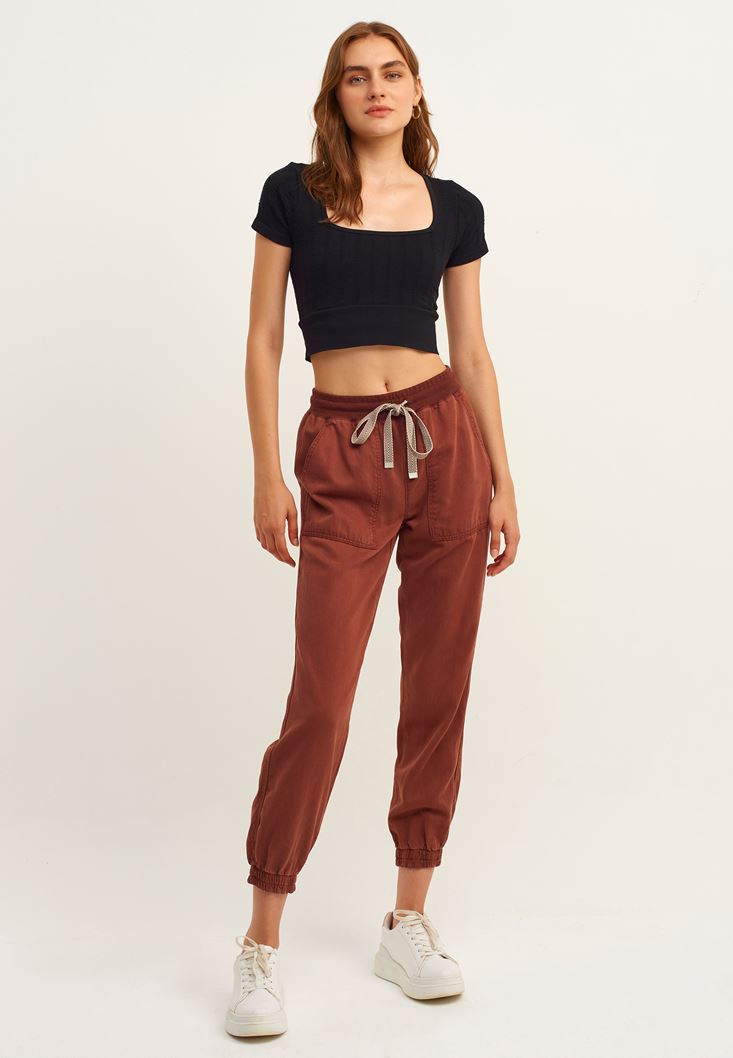 • Bayan Siyah Dikişsiz Kare Yaka Jakar Detaylı Tişört