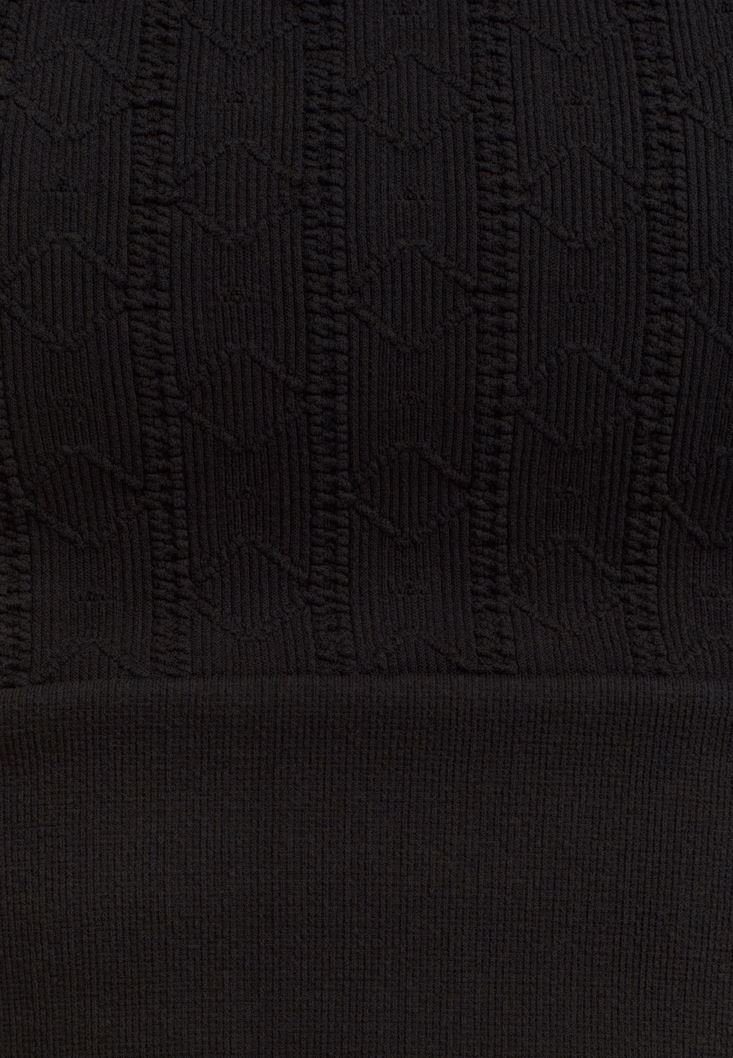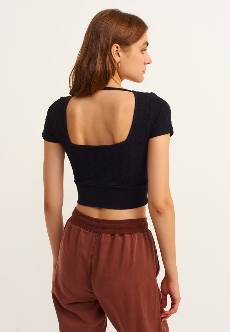 Siyah Dikişsiz Kare Yaka Jakar Detaylı Tişört