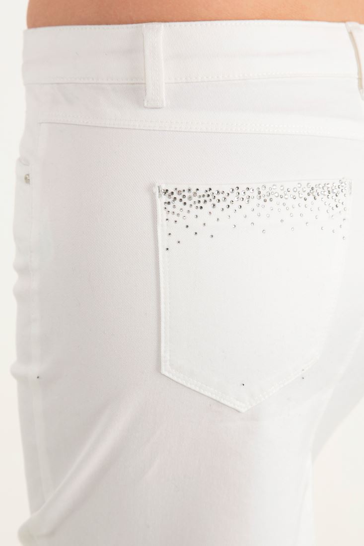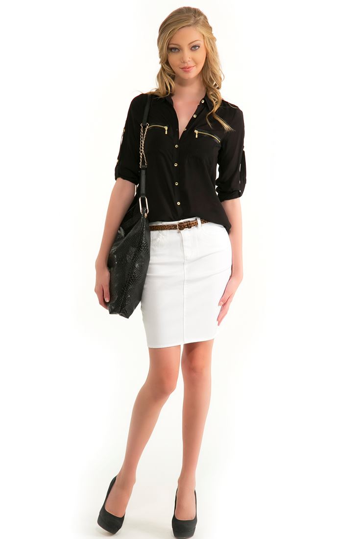 Arka cepleri taş detaylı, arkadan minik yırtmaçlı, diz üstü dar etek.