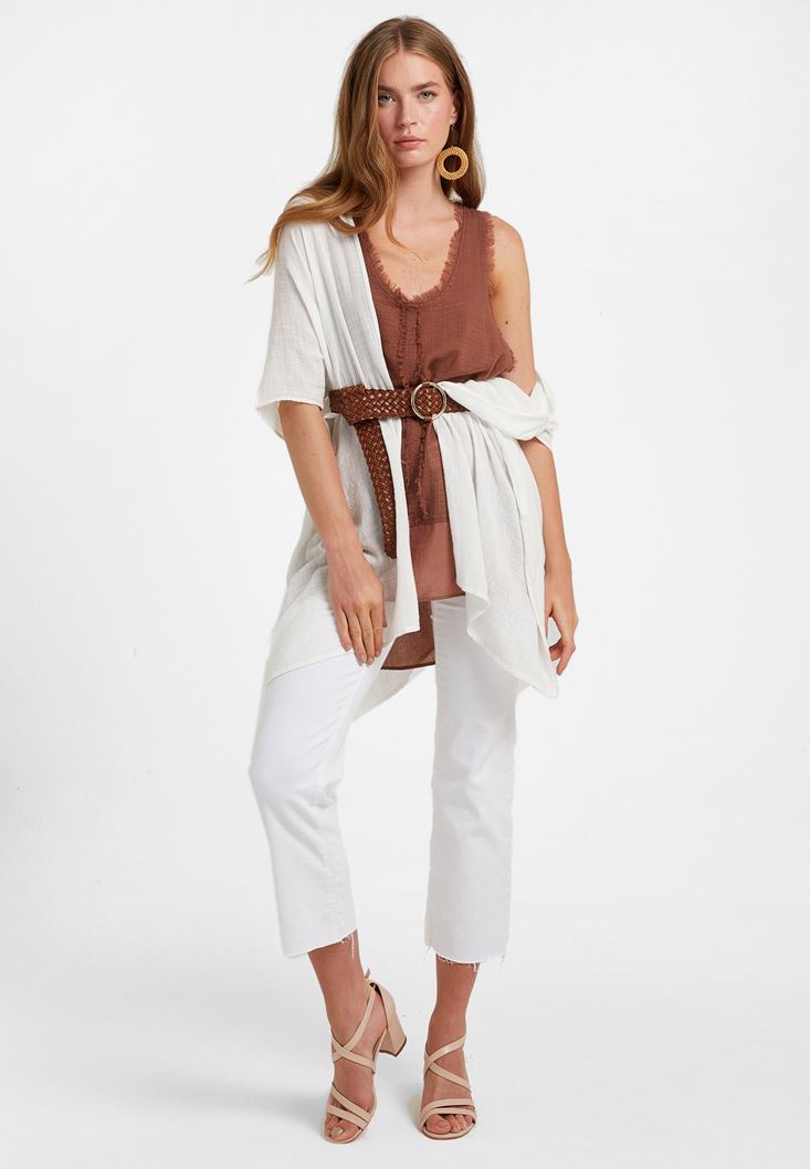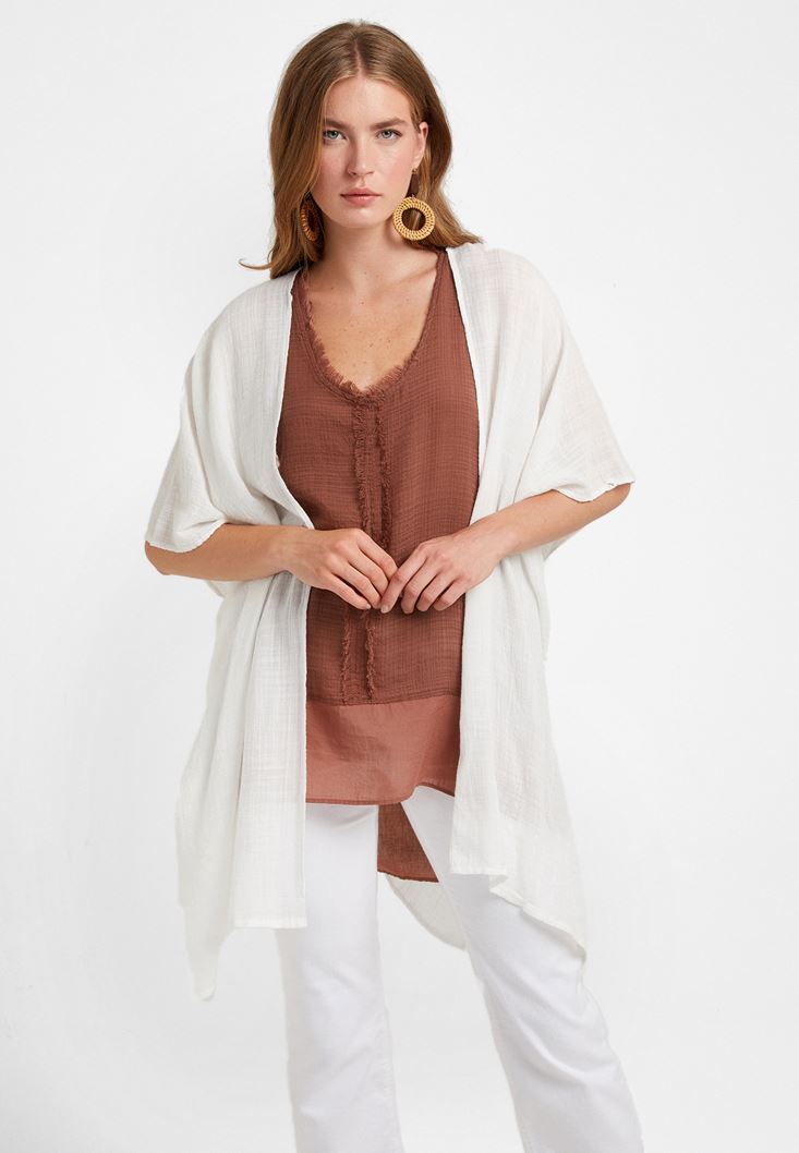 Doğal Görünümlü Kimono modeli, pamuk ve viskon karışımlı yumuşacık dokusu ile yeni sezonda karşınıza çıkıyor. kadın kimono modeli, oversize kalıbı ve yarım kol kesimi sayesinde sizleri rahat kullanımla buluşturuyor. Doğal görünümlü kimono modeli, sırt kısmında yer alan V şeklindeki görünümle benzerleri arasında fark yaratıyor. kadın kimono modelini, konforu ve şıklığı bir arada yakalayacağınız kombinler için tercih edebilirsiniz. Kadın kimono modeli ile crop atletler veya tişörtler kullanarak iddialı görünümlere ulaşabilirsiniz. kadın kimono modeliyle bol pantolonları veya mini şortları bir araya getirerek dikkat çeken kombinler yapabilirsiniz. Oxxo'nun benzersiz ve iddialı ayrıntılarla sizlere sunduğu kadın kimono modelleri ile sezon modasında tarzınızı yansıtabilirsiniz.