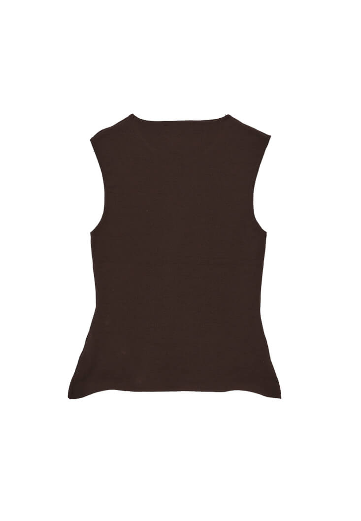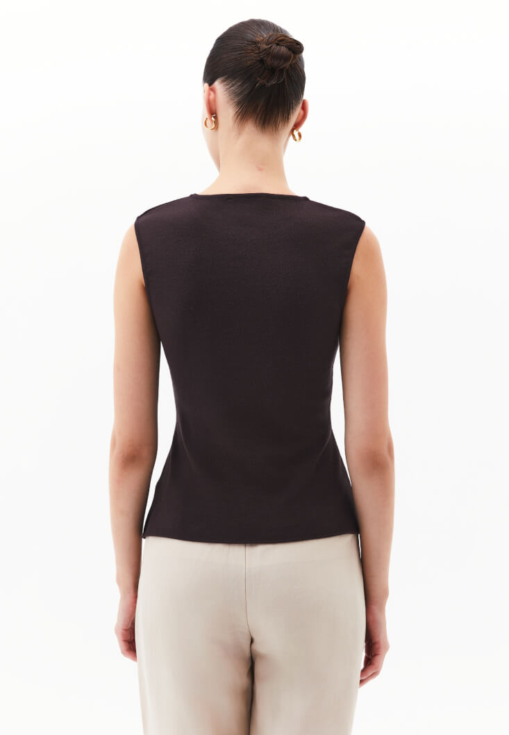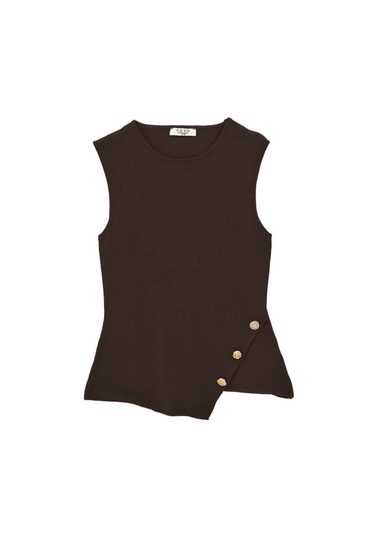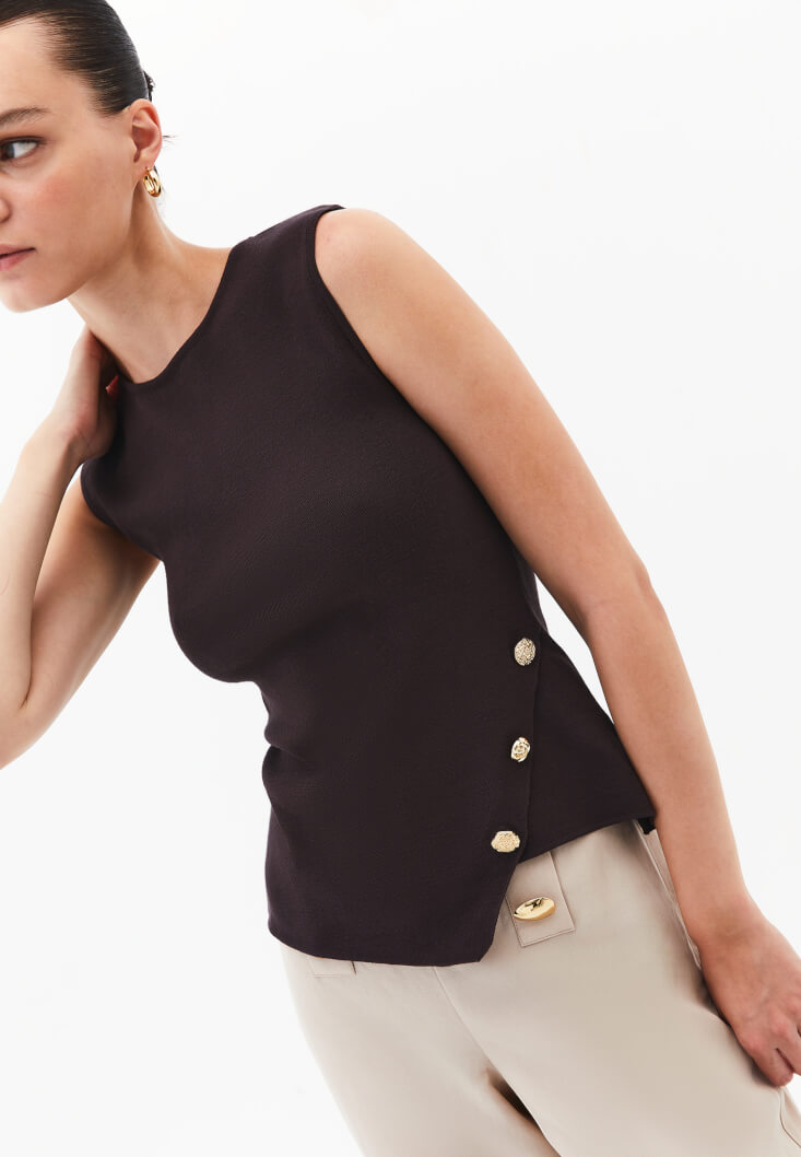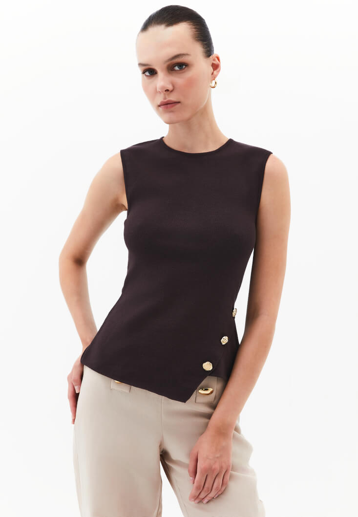 Viskon karışımlı triko, bedeni saran esnek fit, kolsuz tasarım, sıfır yaka, ön kısmı yandan düğme detaylı ve asimetrik kesim.