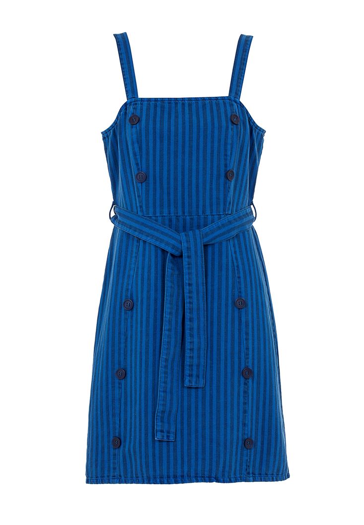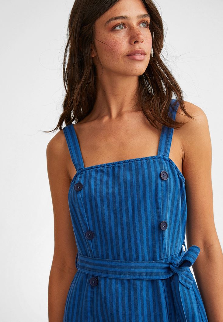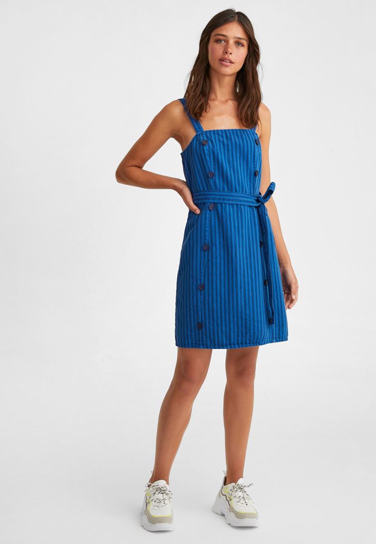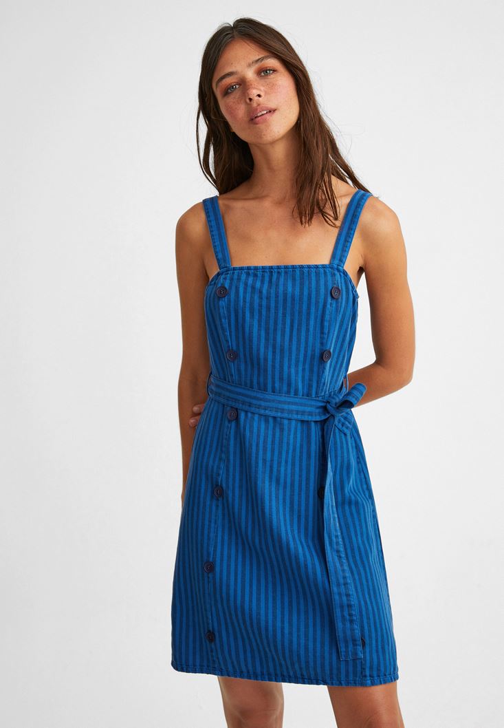 • Bayan Mavi Düğme Detaylı Çizgili Elbise
