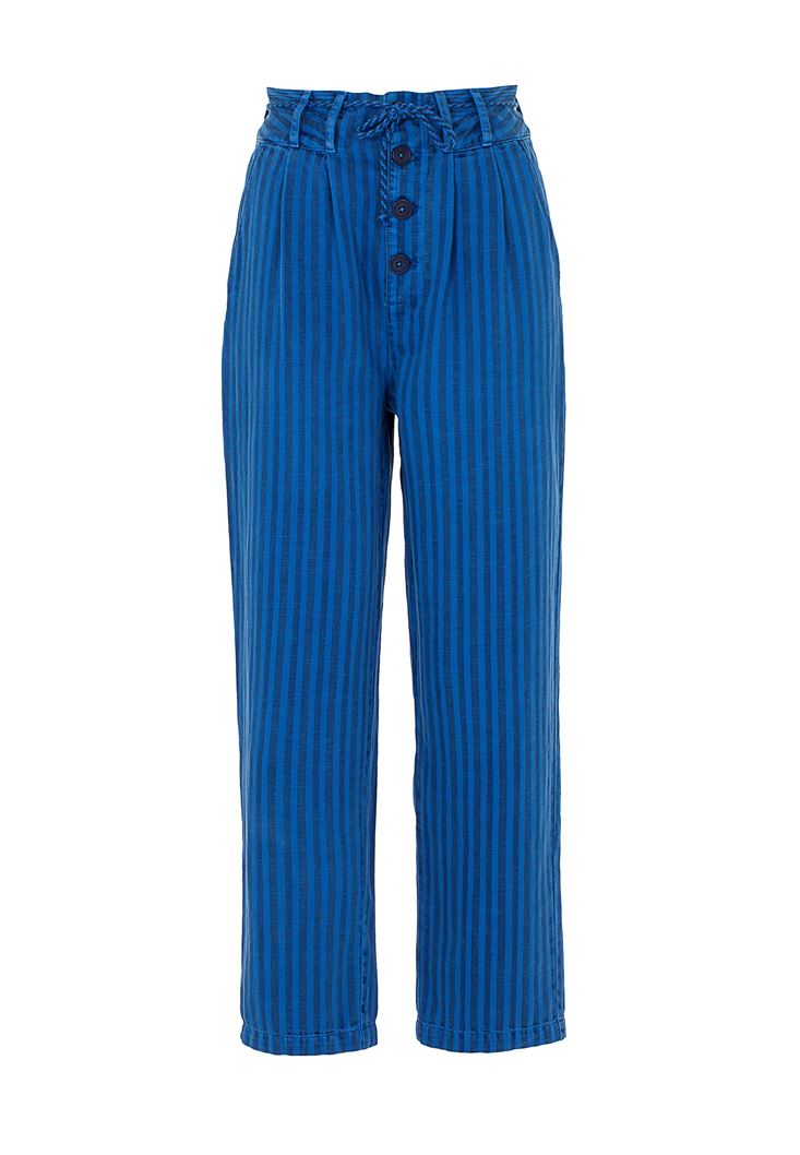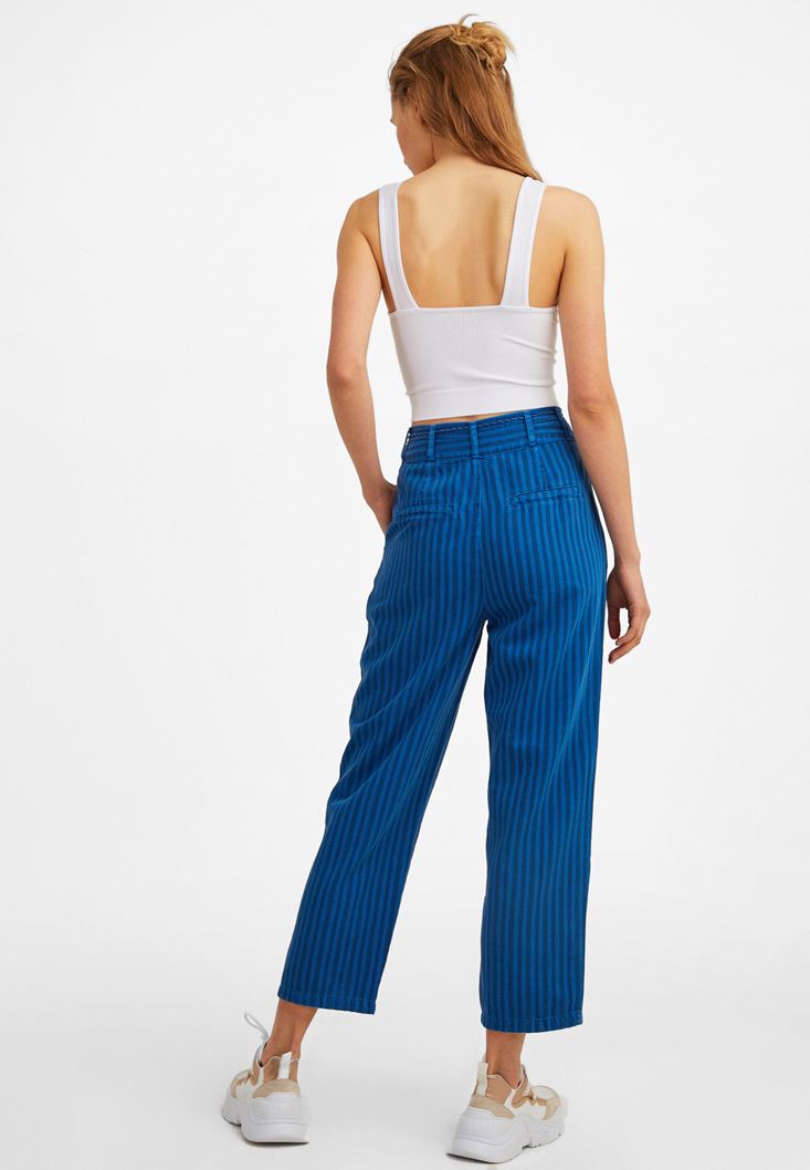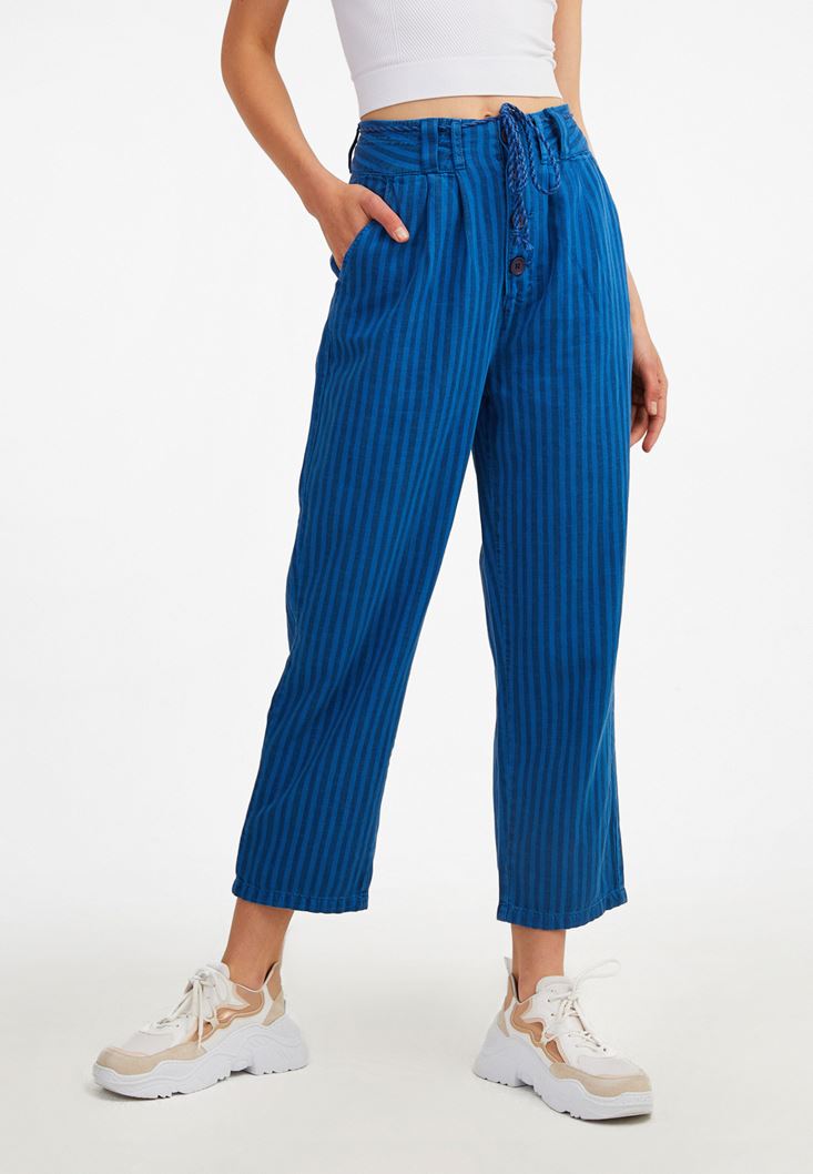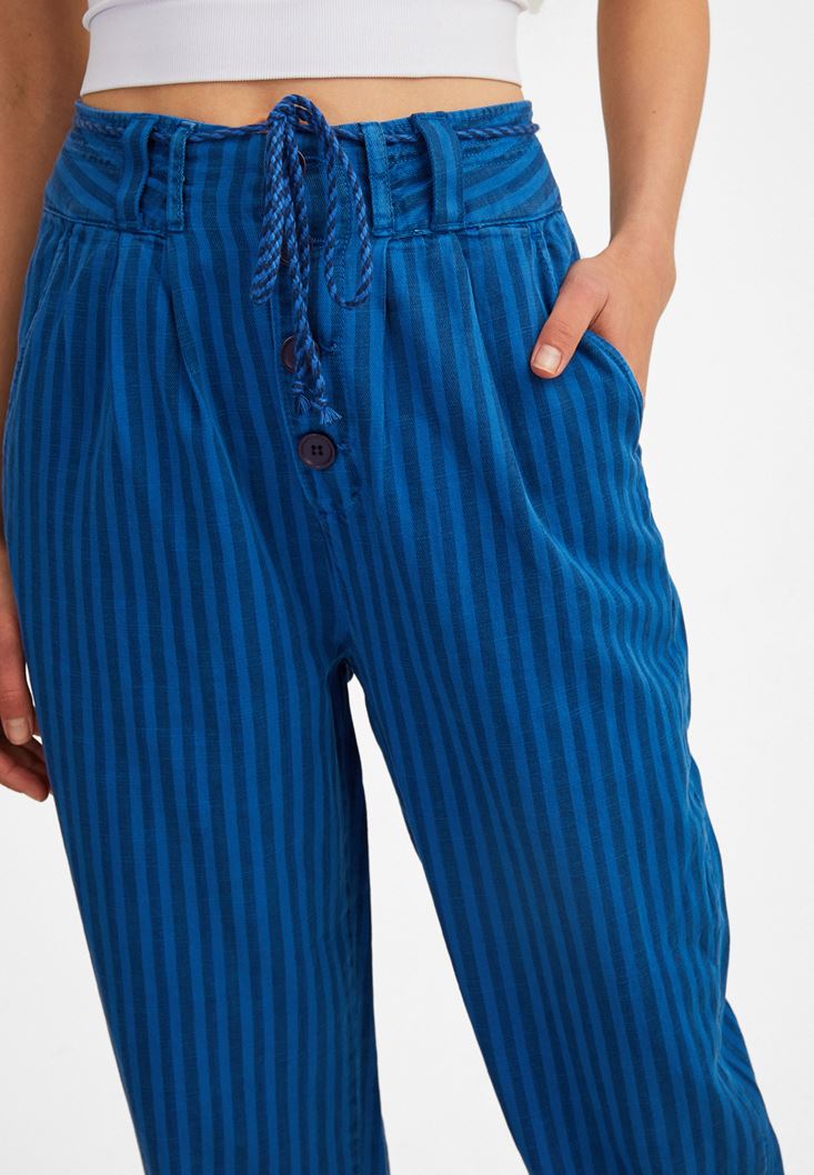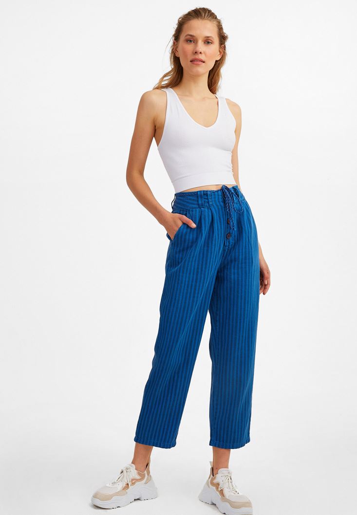 • Bayan Mavi Düğme Detaylı Çizgili Pantolon