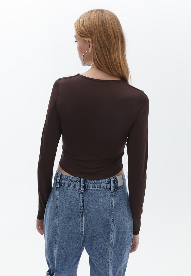 Kahverengi Düğme Detaylı Crop Bluz